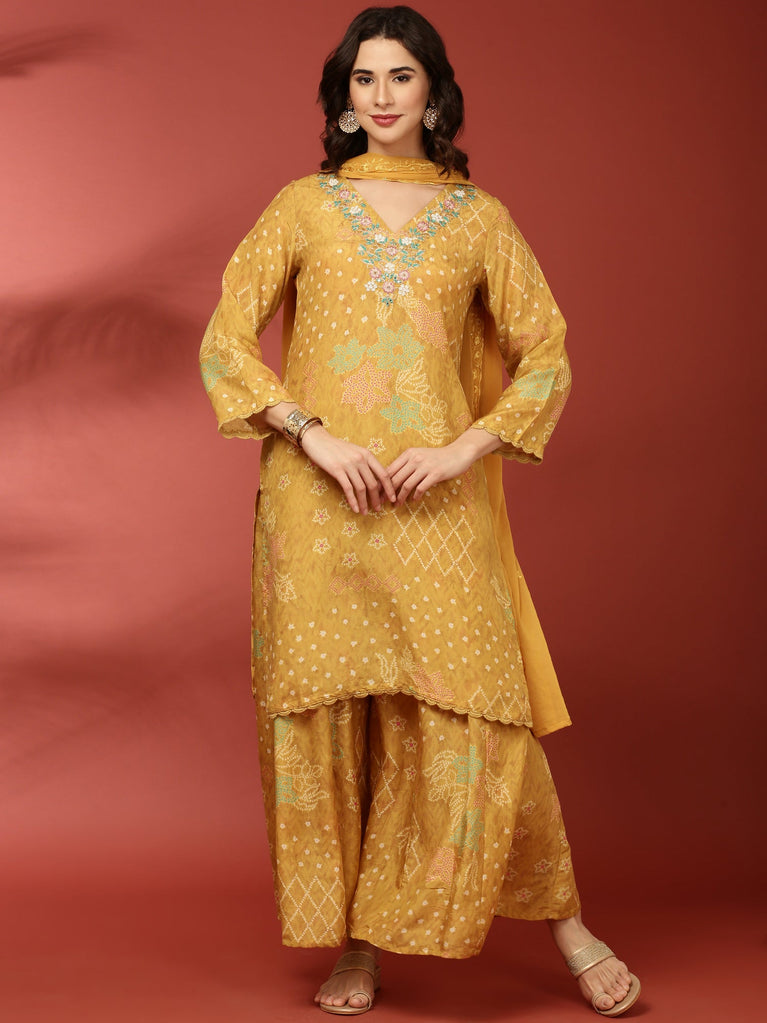 Elevate your ethnic wardrobe with this stunning three-piece ensemble crafted from luxurious dola silk. The rich mustard hue provides a warm, flattering base, while the intricate floral digital print adds contemporary elegance to traditional styling. Perfect for festive occasions, celebrations, or everyday sophistication, this versatile set combines comfort with timeless appeal. The premium fabric drapes beautifully, ensuring you look and feel confident at every event. Embrace the perfect blend of classic charm and modern design.