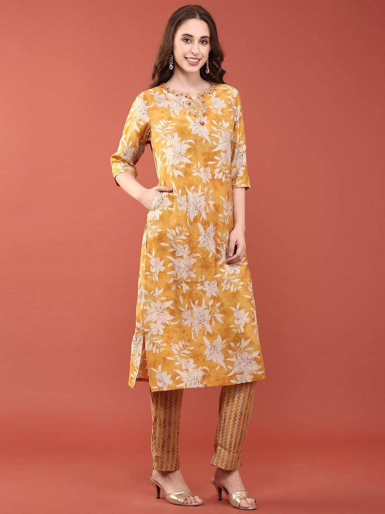 Elevate your wardrobe with this mustard floral printed crepe three-piece suit set. Crafted for comfort and style, the breathable crepe fabric drapes gracefully, while the intricate floral patterns add an elegant touch. Perfect for both formal occasions and stylish gatherings, this set combines sophistication with effortless charm.
