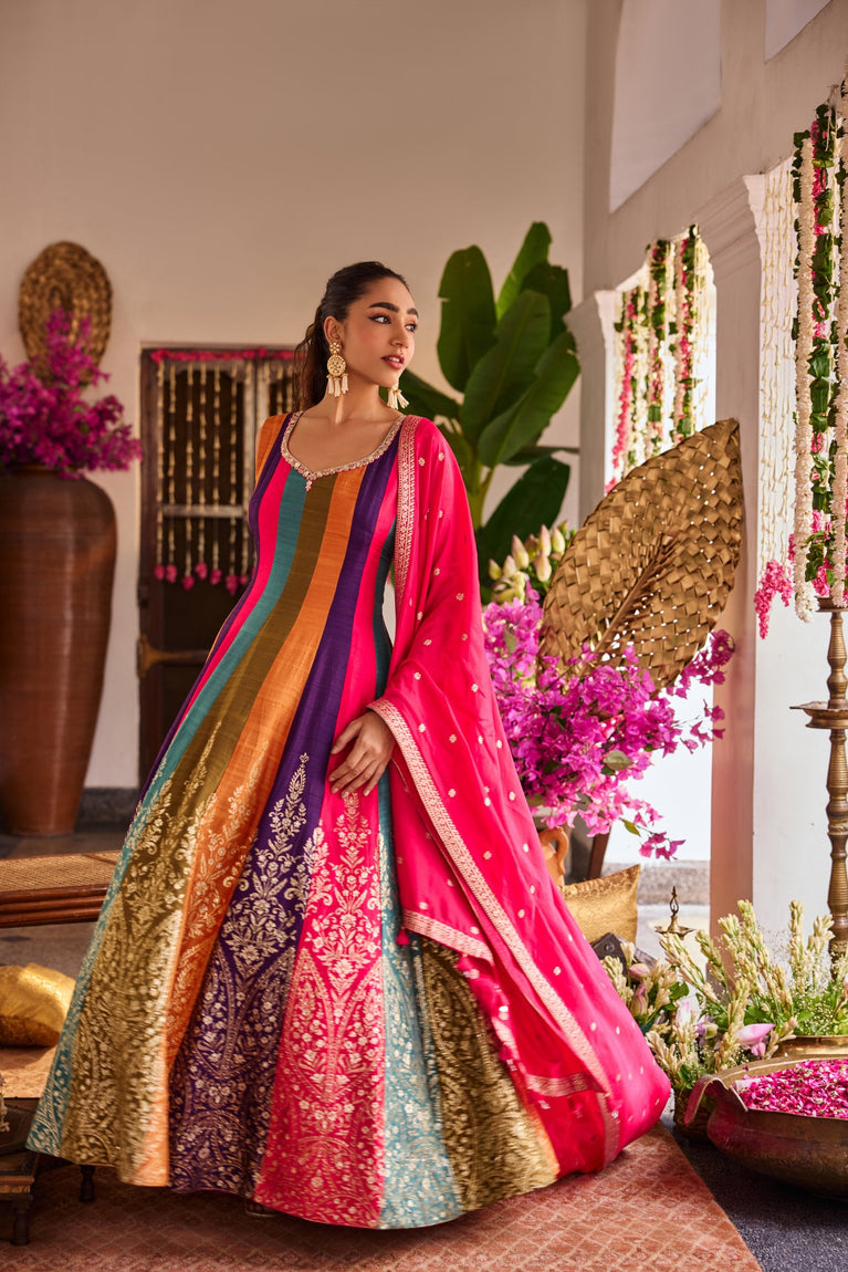 Elevate your traditional wardrobe with this mustard and green striped silk anarkali set, beautifully embroidered to add a touch of elegance. The rich silk fabric offers a luxurious feel, while the intricate embroidery highlights the craftsmanship. Perfect for festive occasions or special events, this set combines comfort with style to ensure you stand out gracefully.