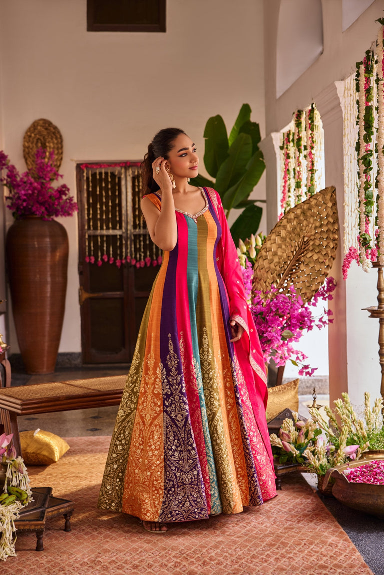 Elevate your wardrobe with this Multi Color Tissue Hand Embroidery Anarkali, showcasing intricate craftsmanship on lightweight tissue fabric. The vibrant hand embroidery adds a refined texture and color interplay, perfect for festive occasions or elegant gatherings. Its flowing silhouette combines tradition with grace, ensuring a sophisticated presence wherever you go.
