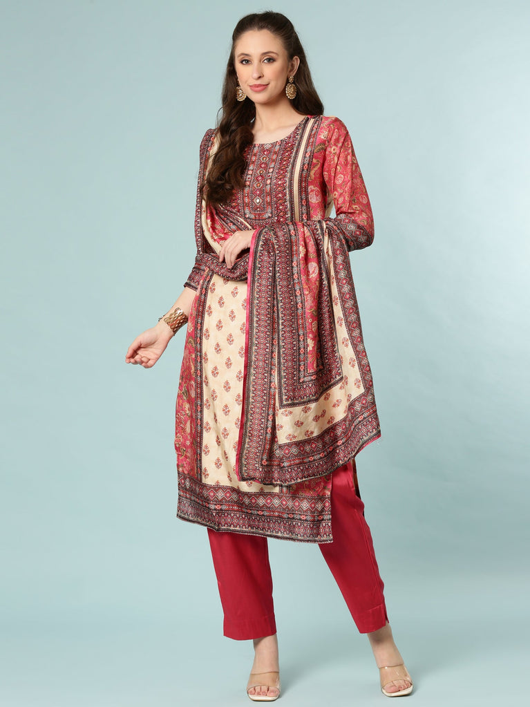 Elevate your wardrobe with this exquisite Cream Silk Digital Printed Three Piece Set, a perfect blend of elegance and versatility. Crafted from premium silk, this ensemble features stunning digital prints that showcase intricate artistry and contemporary design. The three-piece composition offers endless styling possibilities—wear each piece individually or together for a coordinated, sophisticated look. Ideal for festive occasions, celebrations, or elevated everyday wear, this set combines comfort with timeless grace. The luxurious silk fabric drapes beautifully, enhancing your natural silhouette while providing a soft, breathable feel. Make a refined statement with this must-have addition to your collection.