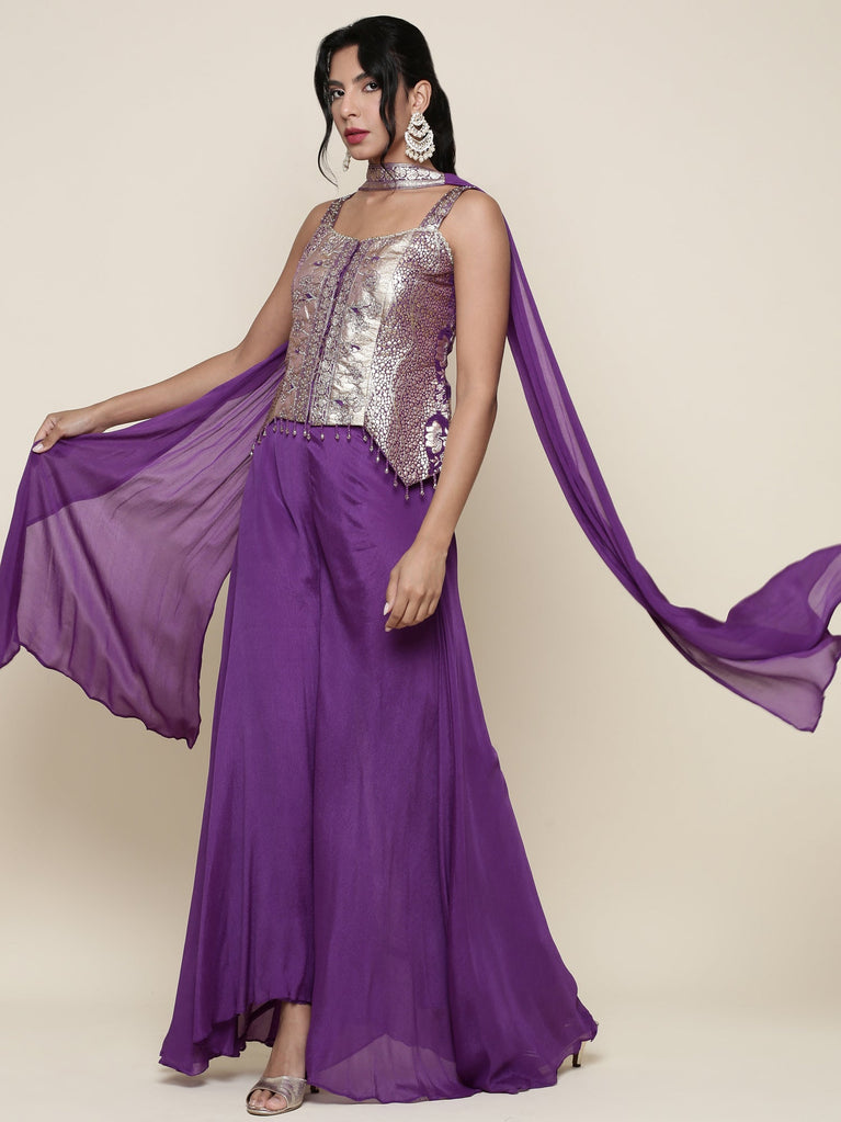 Elevate your ethnic wardrobe with this exquisite Lilac Chinnon three-piece ensemble. Crafted from premium chinnon fabric, known for its lightweight breathability and elegant drape, this set combines traditional sophistication with contemporary styling. The soft lilac hue offers versatility for both festive occasions and everyday wear.