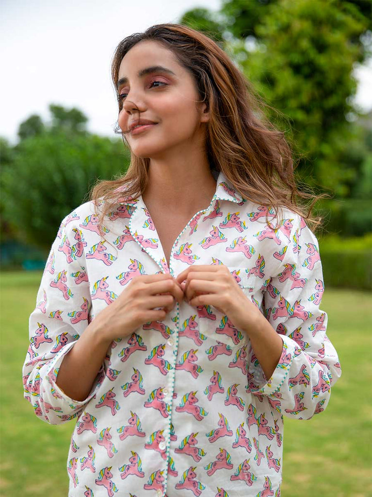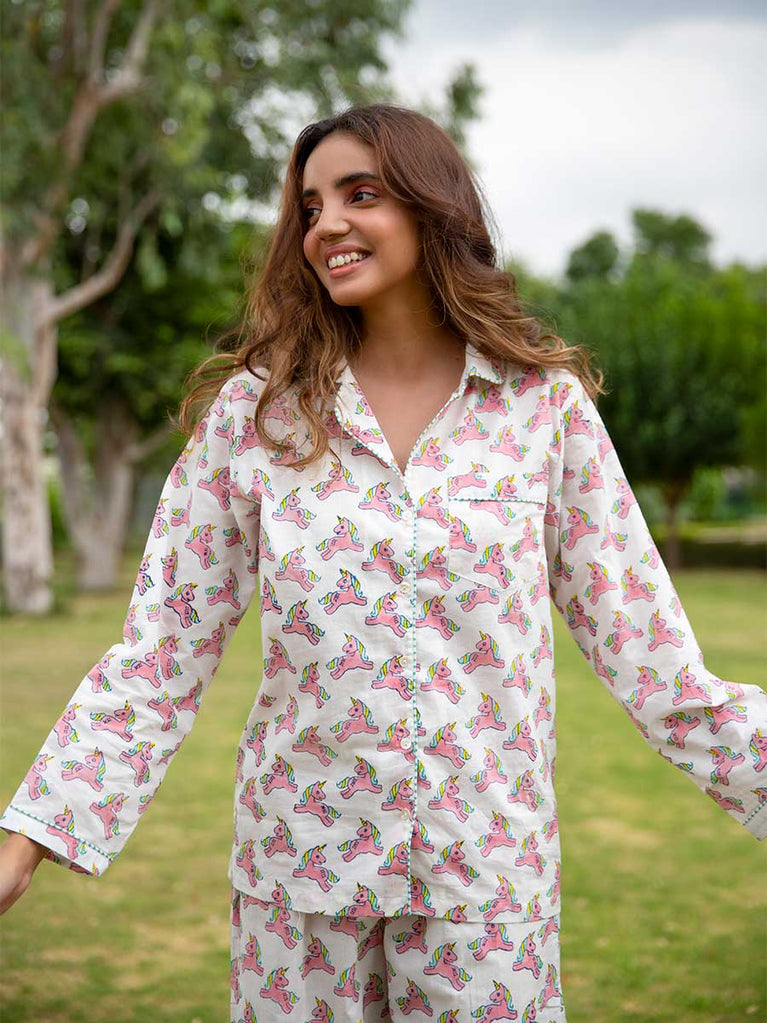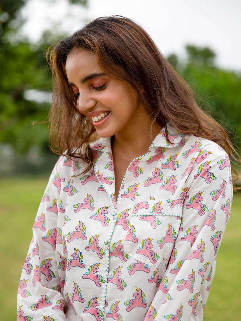 Unicorn Block Printed Cotton Top & Pyjama Set