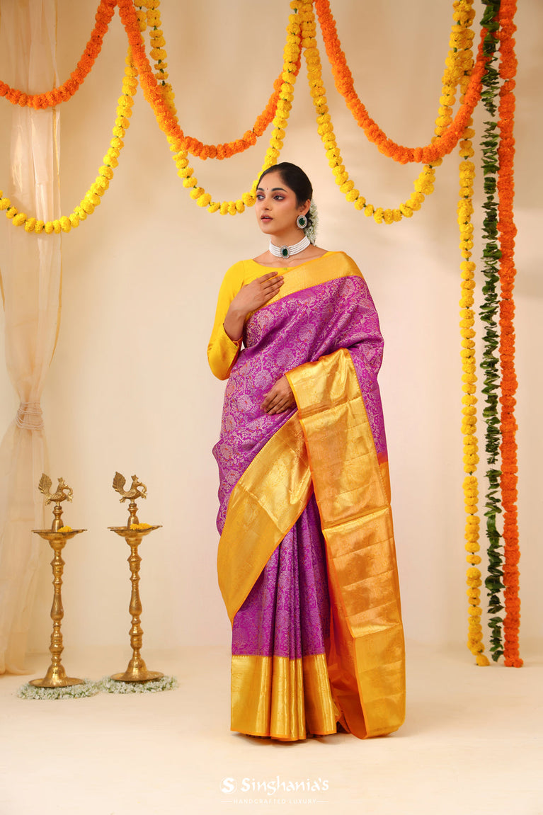 An ornate fusion of cultures - this Dark Magenta Kanjivaram Silk Saree features eclectic gold & tilfi zari woven floral and bird motifs all over. The contrasting yellow big border with floral-paisley and birds pattern, complementing the elegance.