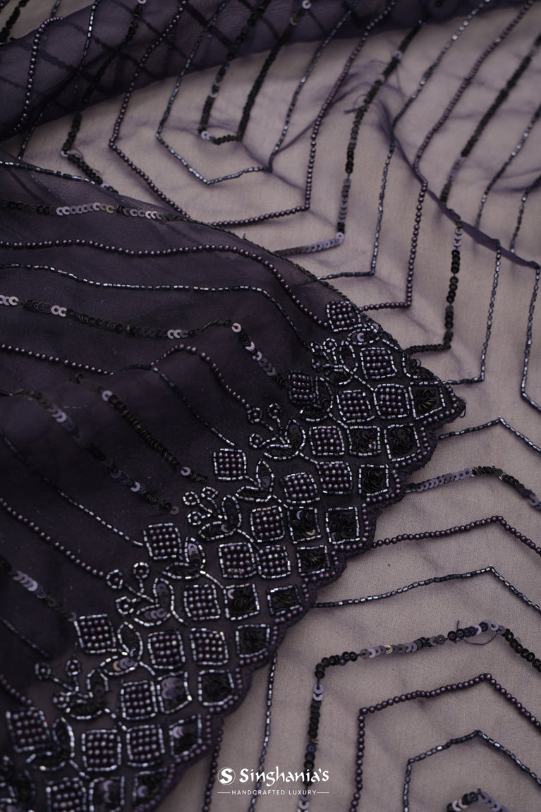 This rich georgette saree in dark navy blue colour has geometrical embroidery all over the saree with intricately embroidered border. It's a great choice for dressing up for a wedding or even for a festive occasion.