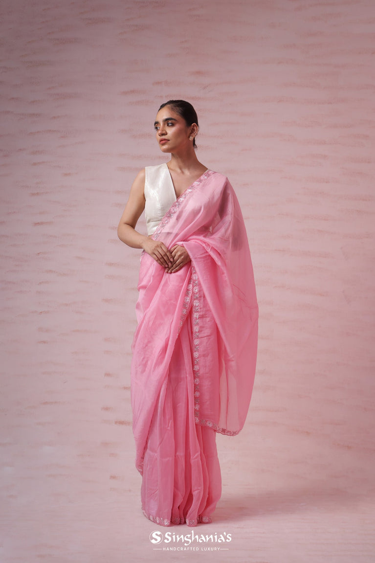 A delicate organza saree in a soft flamingo pink shade with sequins and glass beads embroidery all over. The saree is accentuated with a small embroidered floral patterned border, making it ideal for festive and wedding events.