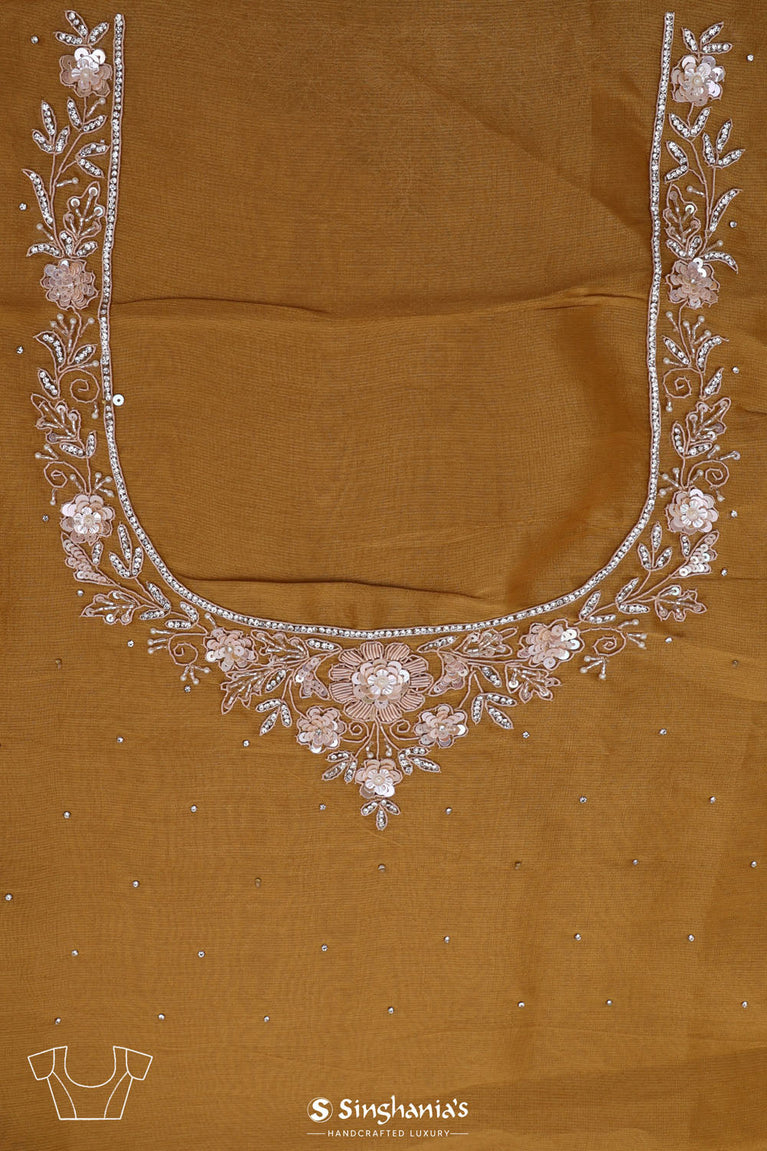 A jewel toned earth yellow saree with a tissue base, which features all over big butta embroidery. Added with floral embroidered scalloped border and pallu, crafted with zardosi, sequins and glass beads. Suitable for festive wear, and wedding parties.