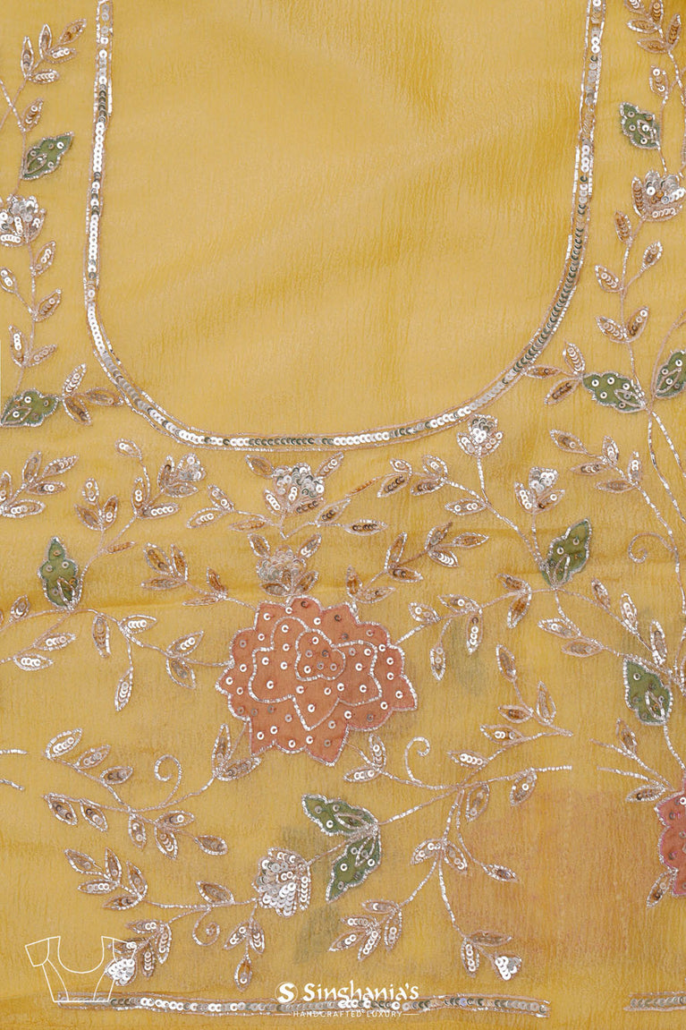 This beautiful gold yellow tissue saree is ideal for party and festive celebrations. The delicate butti work on the body, enhanced by a small floral work in applique work, sequins and glass beads, creates a luxurious and refreshing look. Includes a matching blouse piece.
