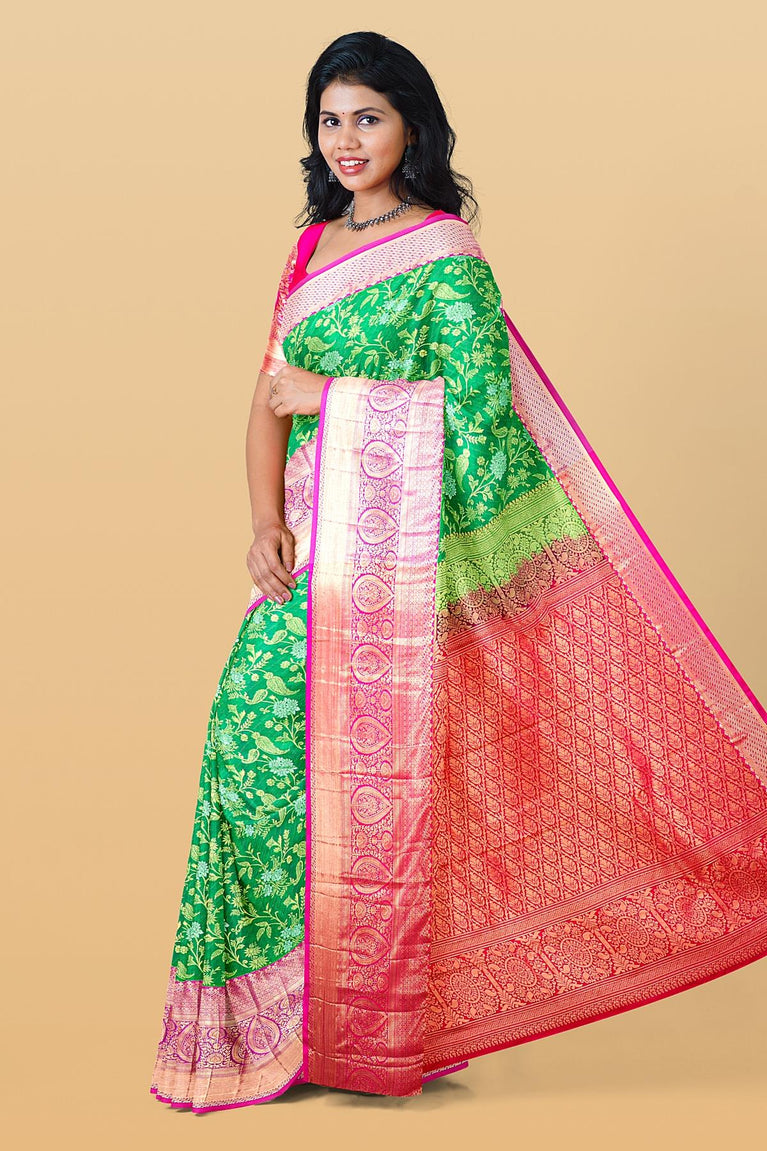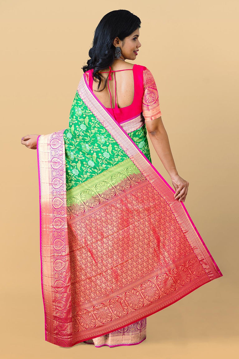 GREEN and PINK FLORAL JAAL SILK BLEND Saree with SEMI PATTU
