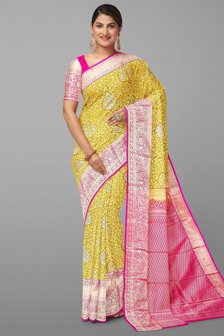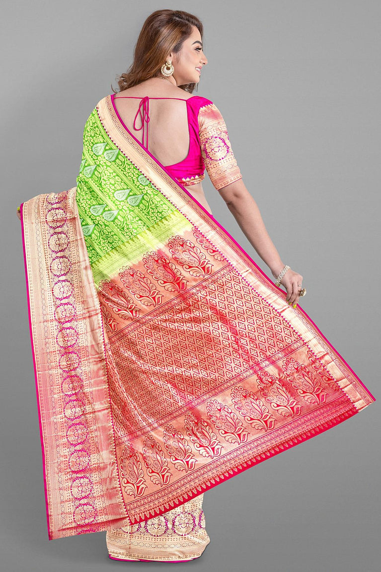 LIGHT GREEN and PINK FLORAL JAAL SILK BLEND Saree with SEMI PATTU