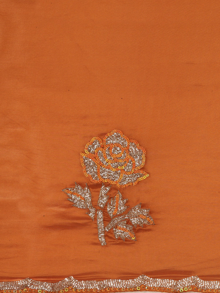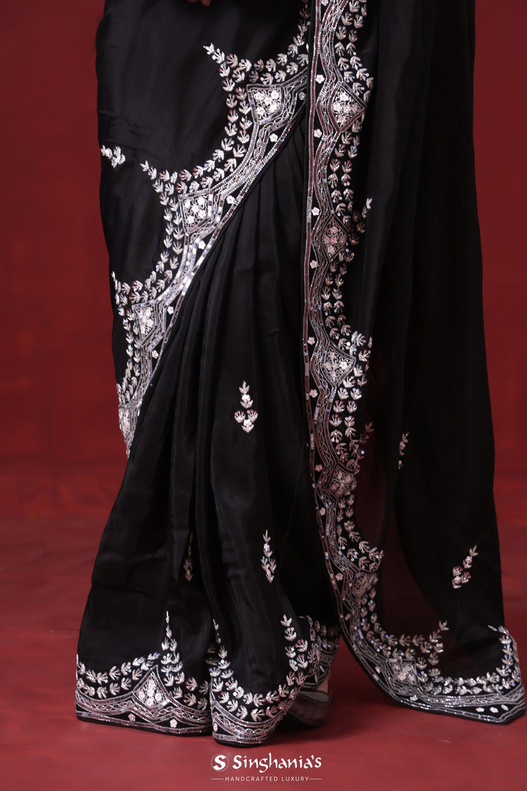 This handcrafted Night Black Tissue Organza Saree is perfect for office wear, weddings, or festive occasions. The saree features floral buttis and a small floral border, designed with sequins and glass beads, creating an enchanting look.