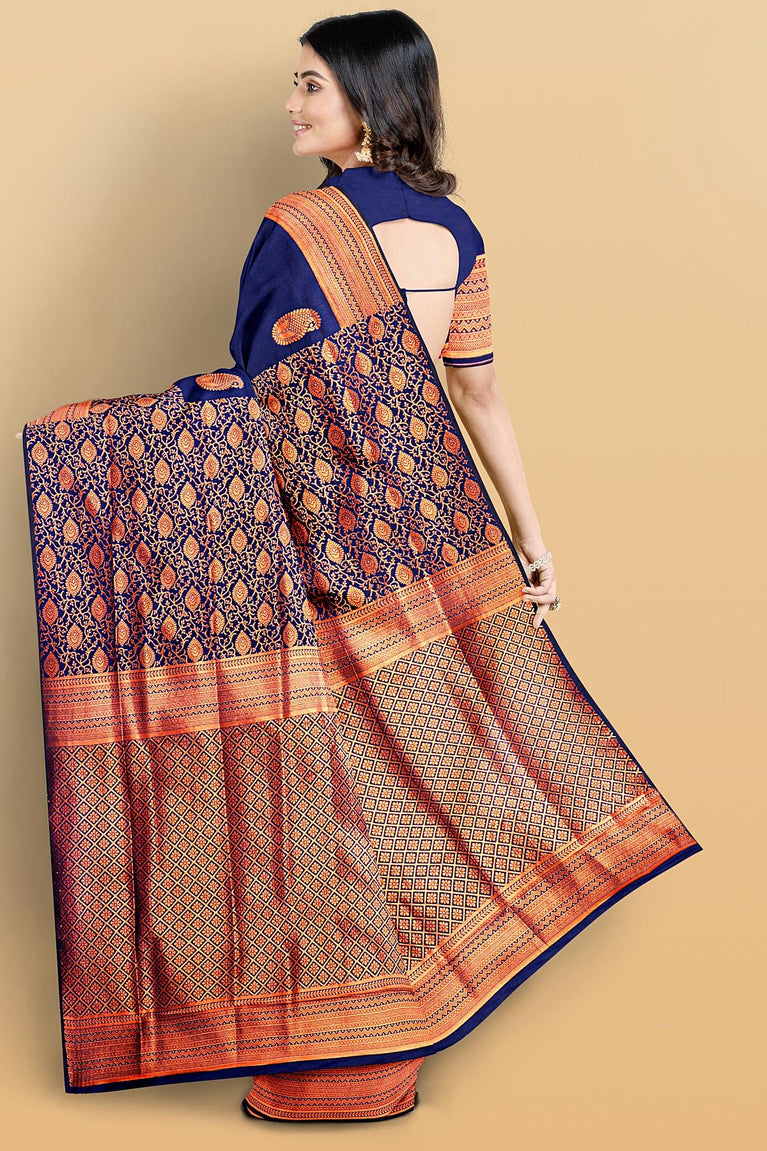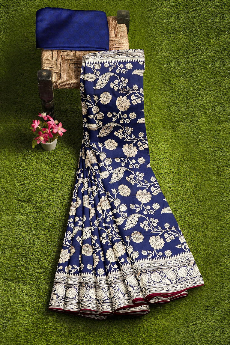 NAVY BLUE and GOLD FLORALS SILK BLEND Saree with SEMI PATTU
