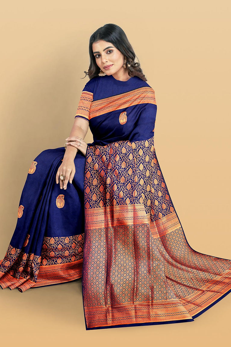 NAVY BLUE and GOLD BUTTIS SILK BLEND Saree with SEMI PATTU