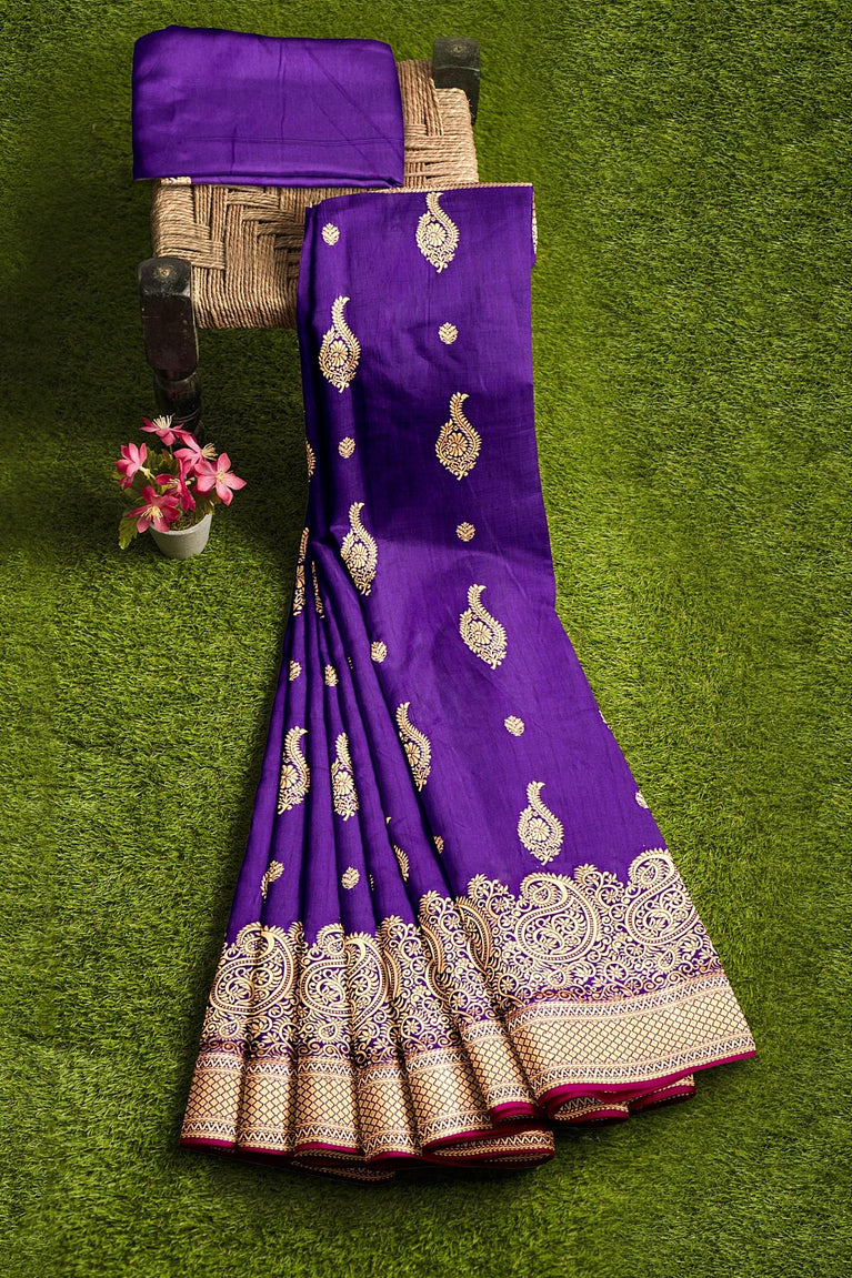PURPLE and GOLD PLAIN SILK BLEND Saree with SEMI PATTU