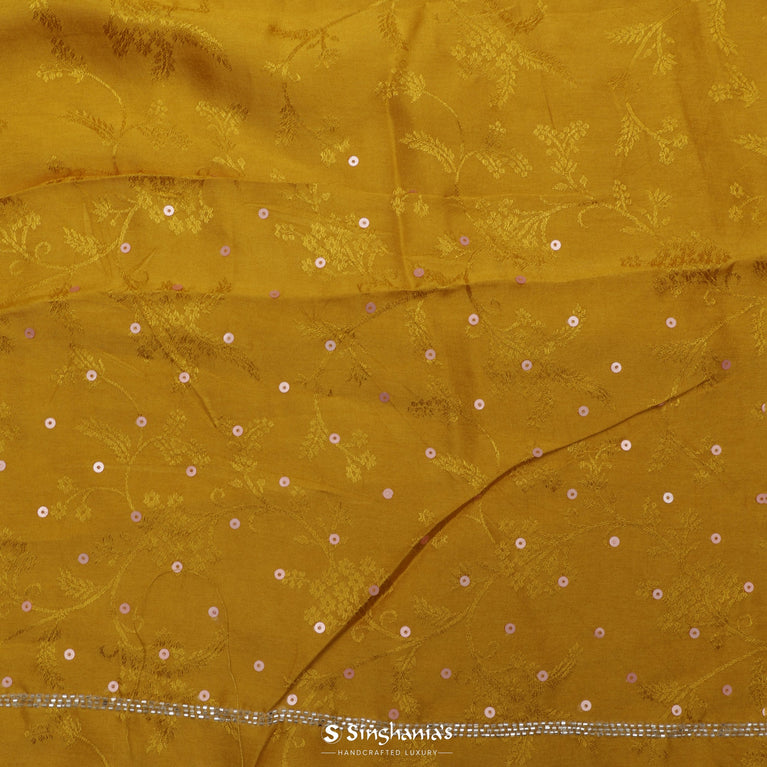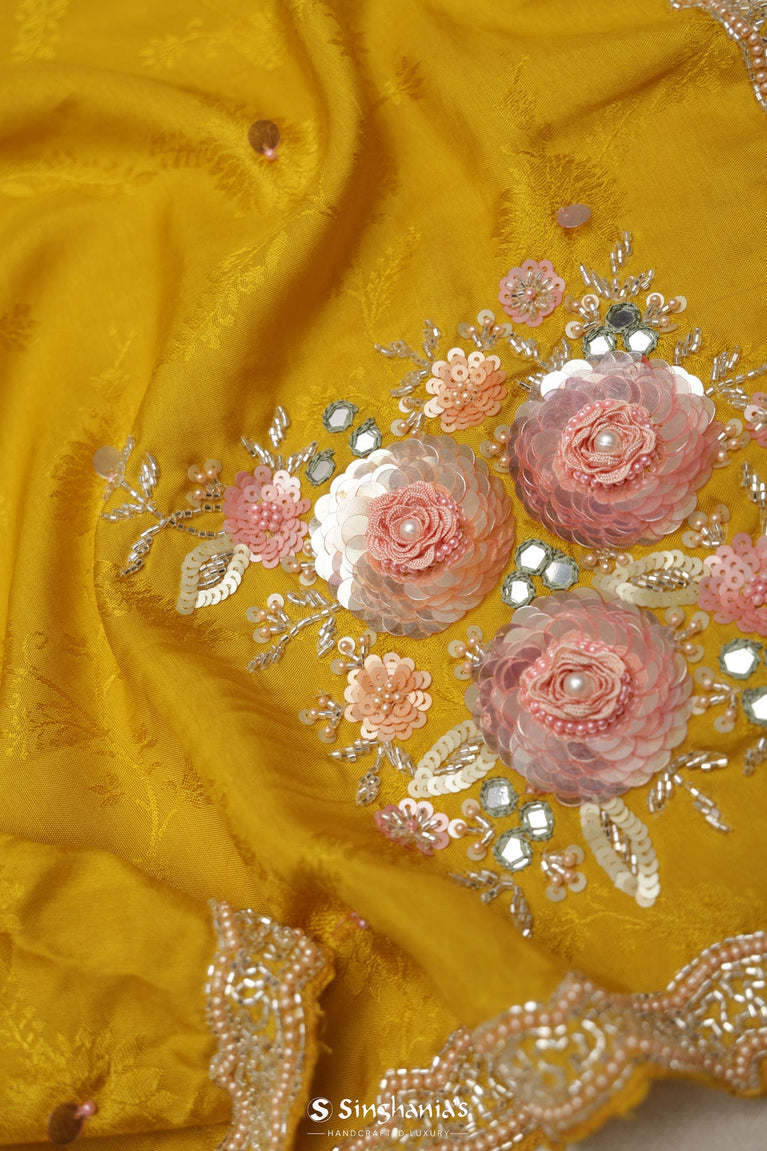Embrace the warmth of this handcrafted Canary Yellow Modal Satin Saree. Ideal for mehandi/haldi, office wear, or wedding parties, it features a delicate floral jaal pattern and a small border, in sequins and glass beads.