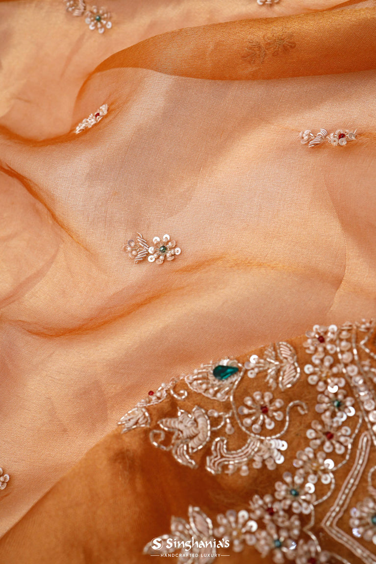 A delicate brown gold saree with a tissue base, which features floral butti embroidered pattern. Added with intricately embroidered floral scalloped border, crafted with sequins and glass beads. Suitable for festive wear, and wedding parties.