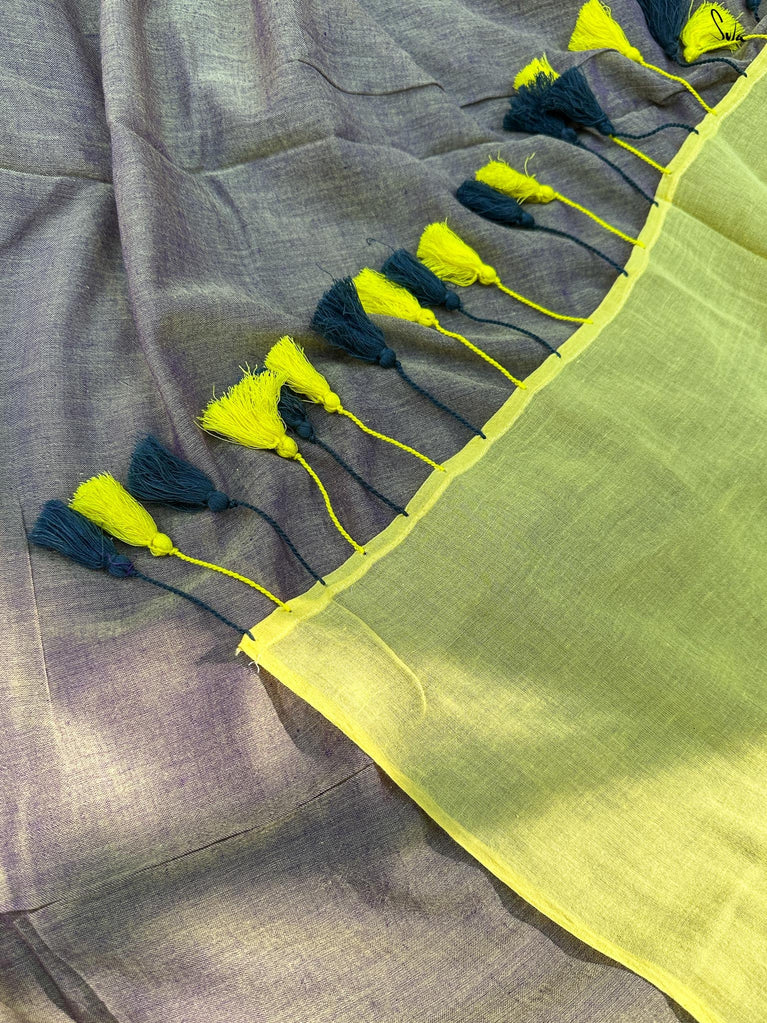 Celebrate yourself when you wear this elegant purple mul cotton saree that’s embellished with delicate gold zari detailing.