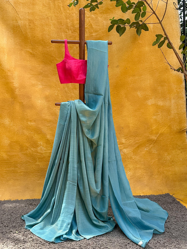 A glass of bold poured into the fabric. This wine crushed viscose saree is rich, moody, and unapologetically dramatic. Contrast tassels and a streak of gota at the border add that intoxicating flash of glam.