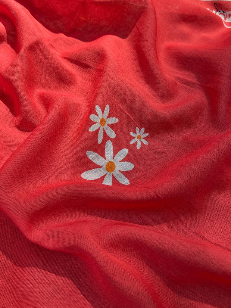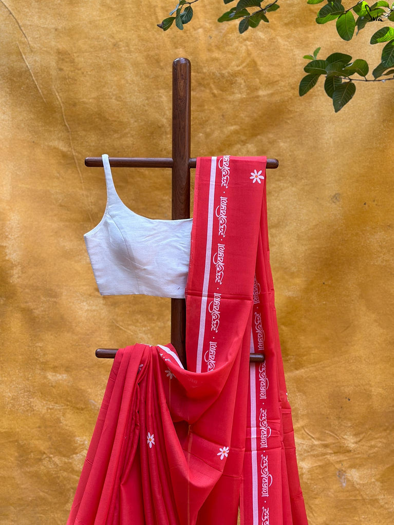 This screen-printed red and white made-in-heaven mul saree is a celebration by itself!
