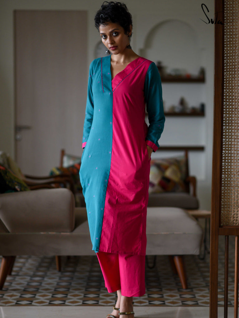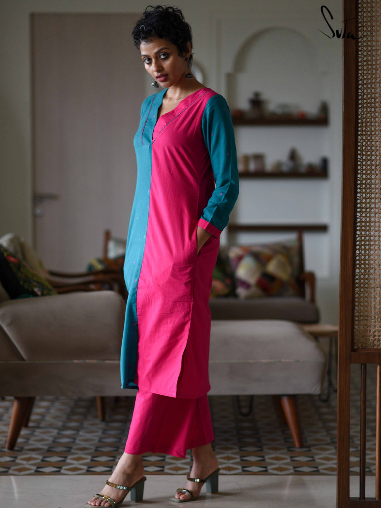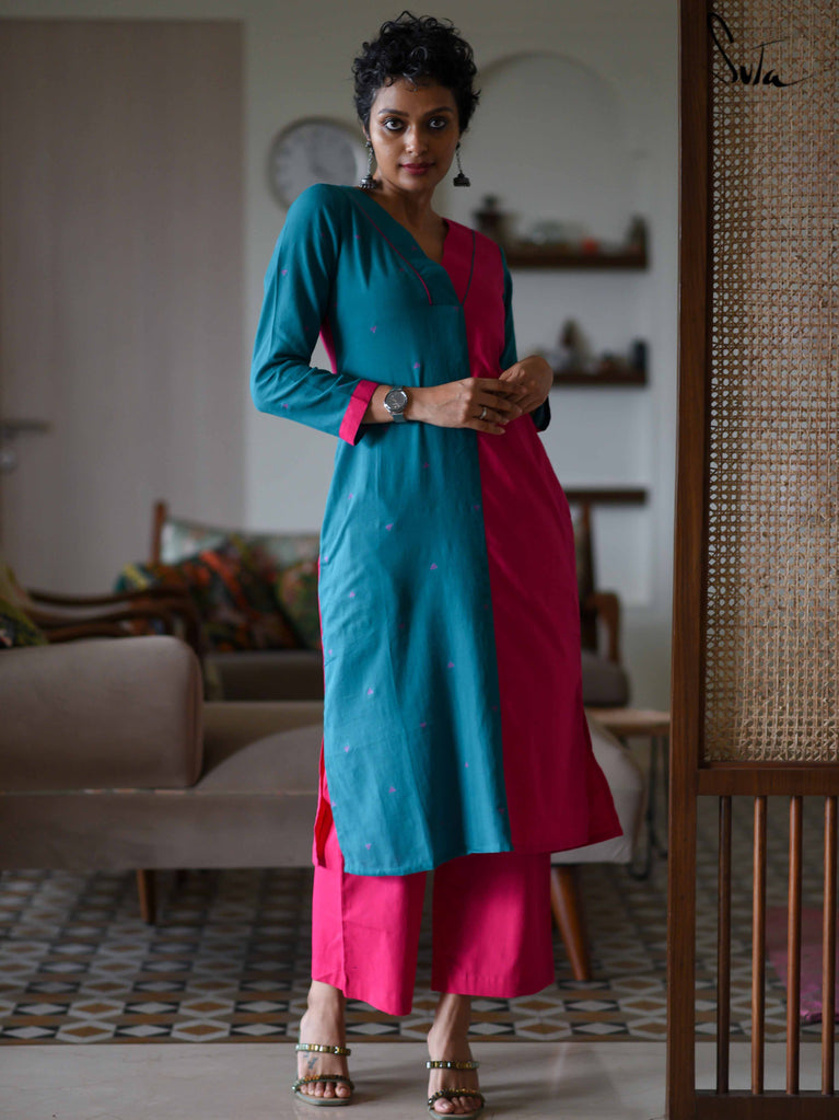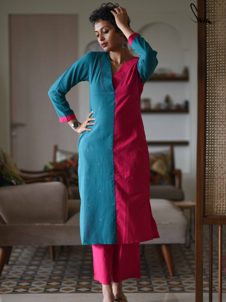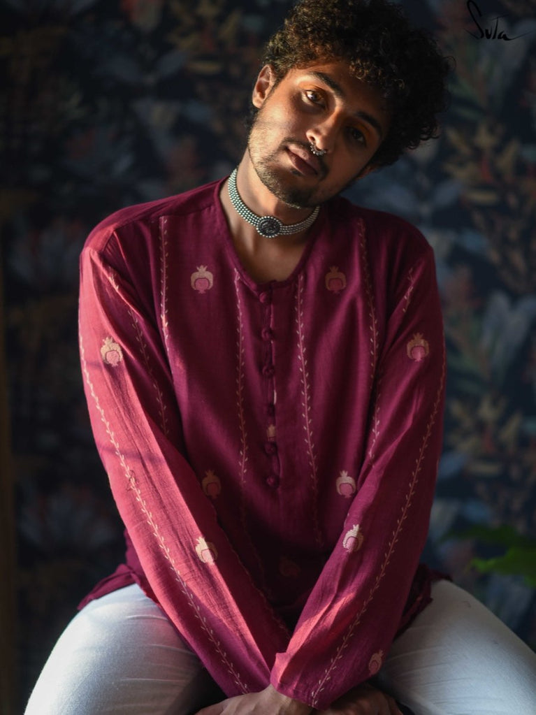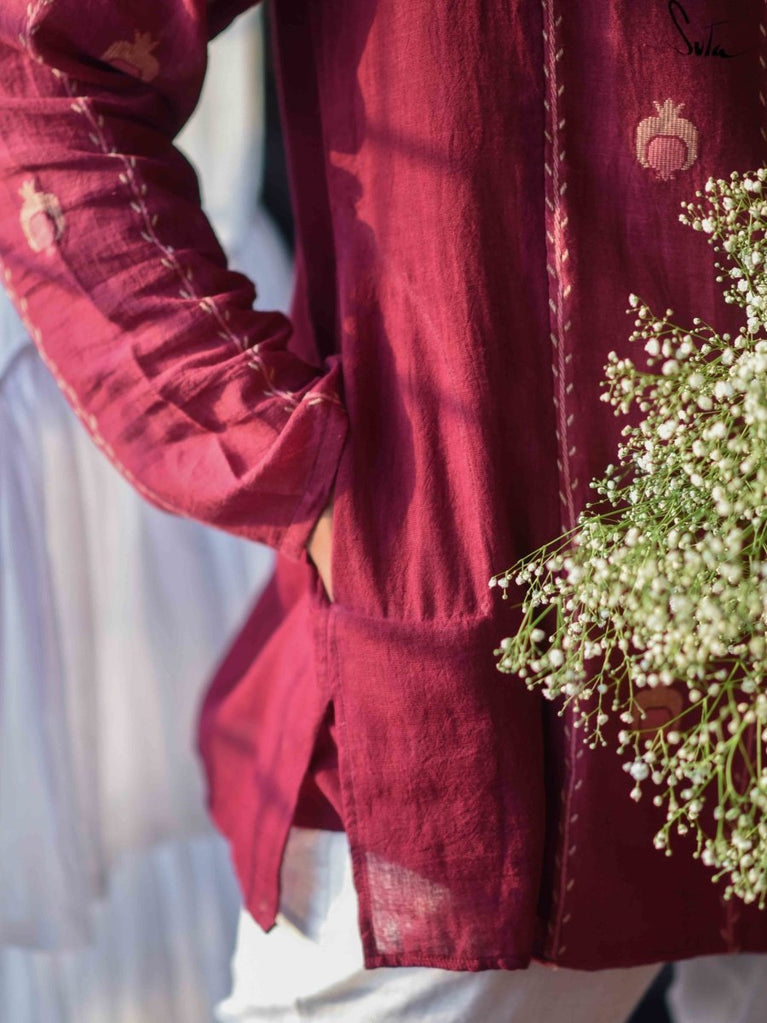This is a handloom cotton kurta. The beautiful pomegranate-inspired motif that symbolizes the co-existence of contrasts is handwoven into the fabric and brings a gorgeous charm to the kurta. It reflects the idea of breaking stereotypes and looking at things in more than one way, of acceptance and un-labeling.Handloom cotton is a type of fabric that is woven using hand operated looms. Two sets of interlacing yarns, the warp (length) and weft (width), are woven on a mechanised loom operated by weavers. These looms do not use electricity. Human handling lends the fabrics a unique feel and renders the fabrics more value. The art of hand weaving is labour intensive and takes a longer time. But, the beauty it adds to the fabric is priceless. Choosing handloom cotton supports the rich weaving heritage of India and lets the weavers carry on the precious art-form to the future generations as well.