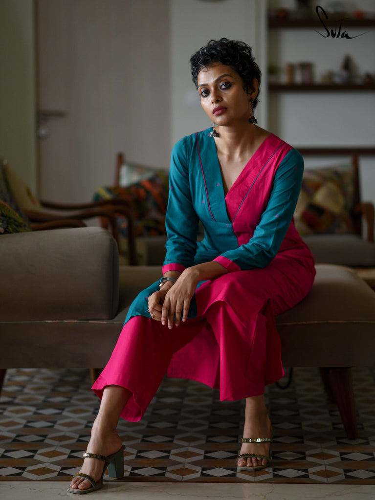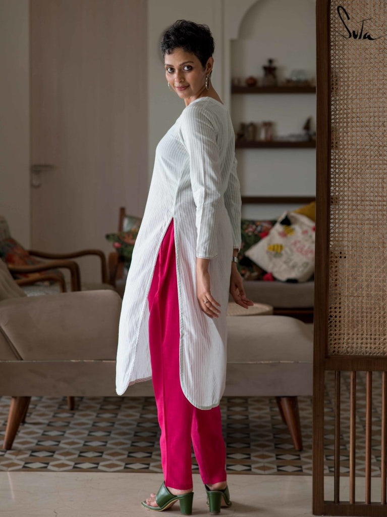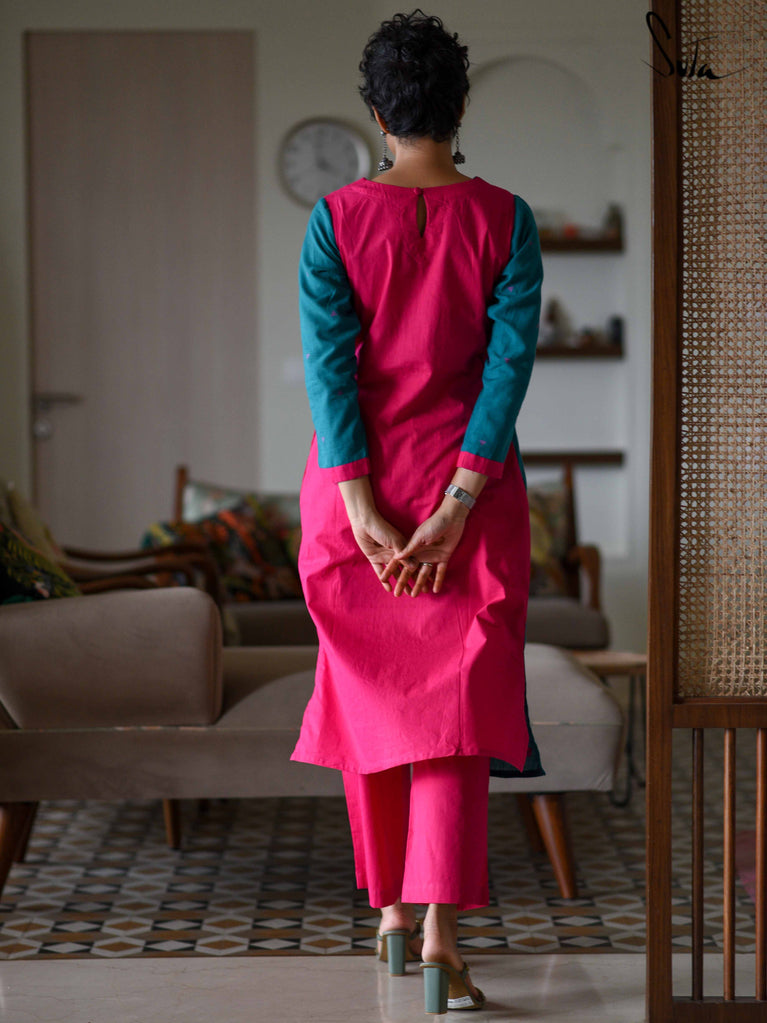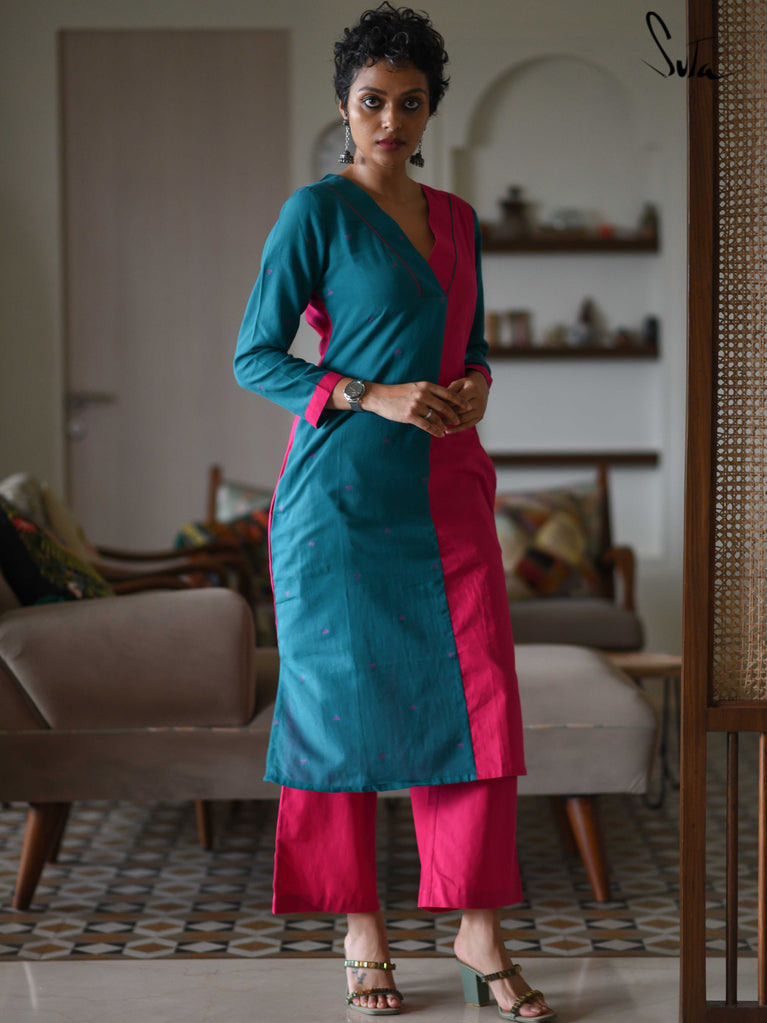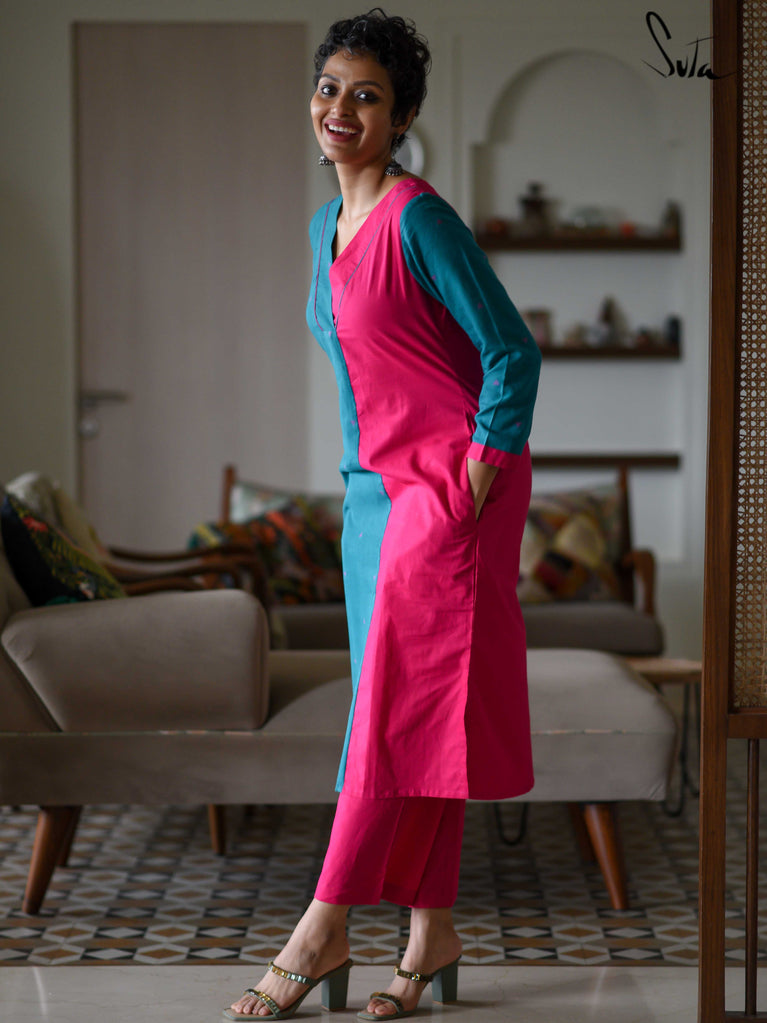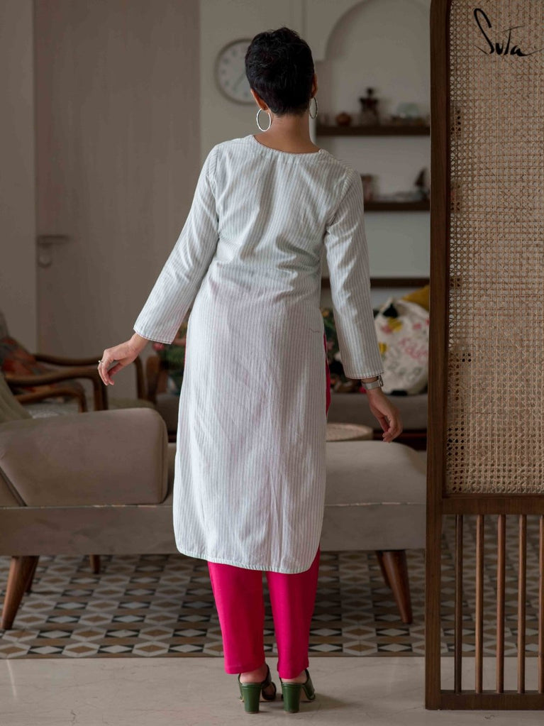 This is a handloom cotton kurta. The beautiful pomegranate-inspired motif that symbolizes the co-existence of contrasts is handwoven into the fabric and brings a gorgeous charm to the kurta. It reflects the idea of breaking stereotypes and looking at things in more than one way, of acceptance and un-labeling.Handloom cotton is a type of fabric that is woven using hand operated looms. Two sets of interlacing yarns, the warp (length) and weft (width), are woven on a mechanised loom operated by weavers. These looms do not use electricity. Human handling lends the fabrics a unique feel and renders the fabrics more value. The art of hand weaving is labour intensive and takes a longer time. But, the beauty it adds to the fabric is priceless. Choosing handloom cotton supports the rich weaving heritage of India and lets the weavers carry on the precious art-form to the future generations as well.