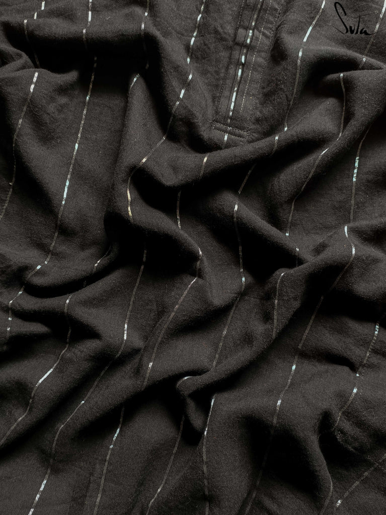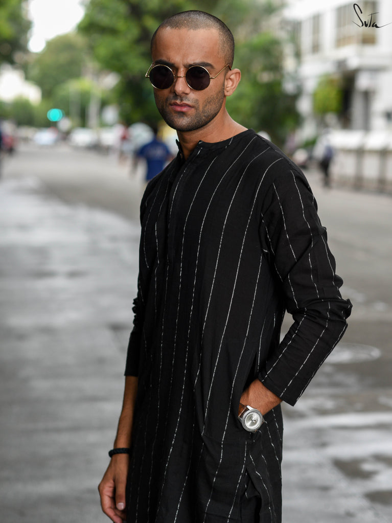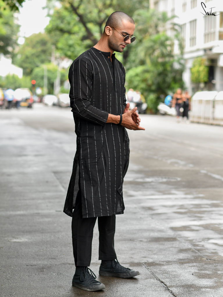 Walk the talk in your own inimitable style, when you wear this smart black cotton kurta.