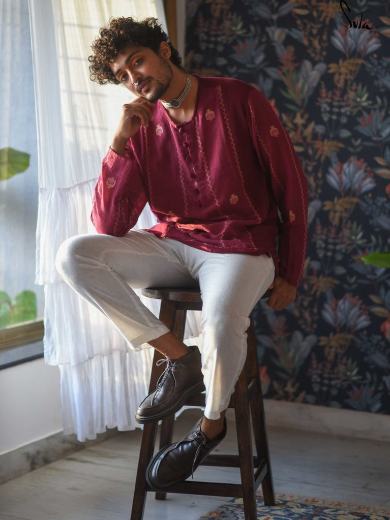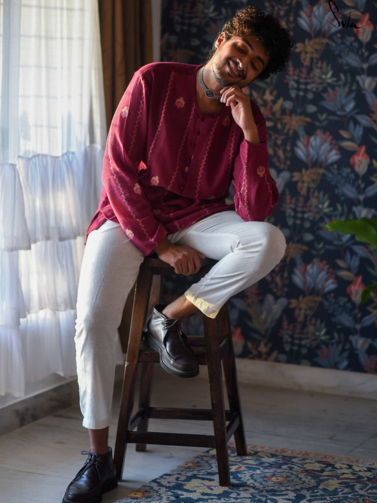 This maroon handloom cotton short kurta with full sleeves and beige-pink detailing is a breezy comfortable piece that will keep you at ease all day long and yet make a style statement.