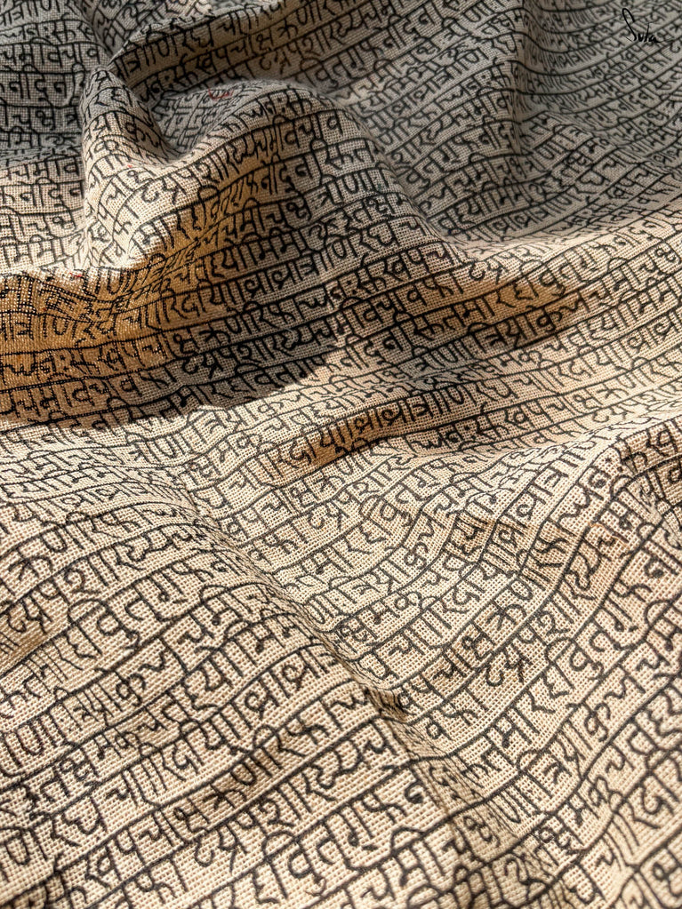 Off-white cotton viscose forms the base for a captivating print, showcasing illustrations of women engaged in various Onam festivities. The artwork brings the spirit of the harvest festival to life, while a classic gold zari border frames the design with a touch of elegance.