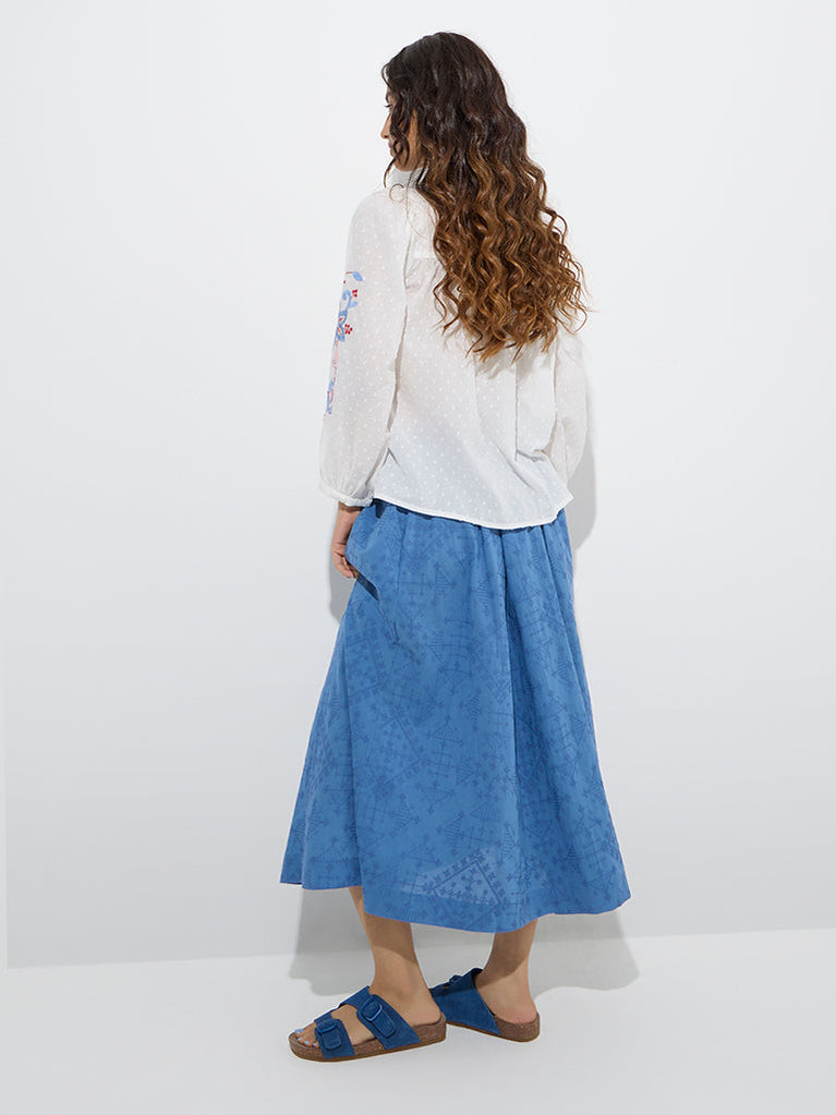 This white blouse from Bombay Paisley is fashioned with floral patterns and swiss dot embroidery that add a touch of timeless elegance. Crafted from pure cotton for elevated comfort, it features a split neck that flows into a neat button placket, while blouson sleeves lend a relaxed yet refined silhouette.