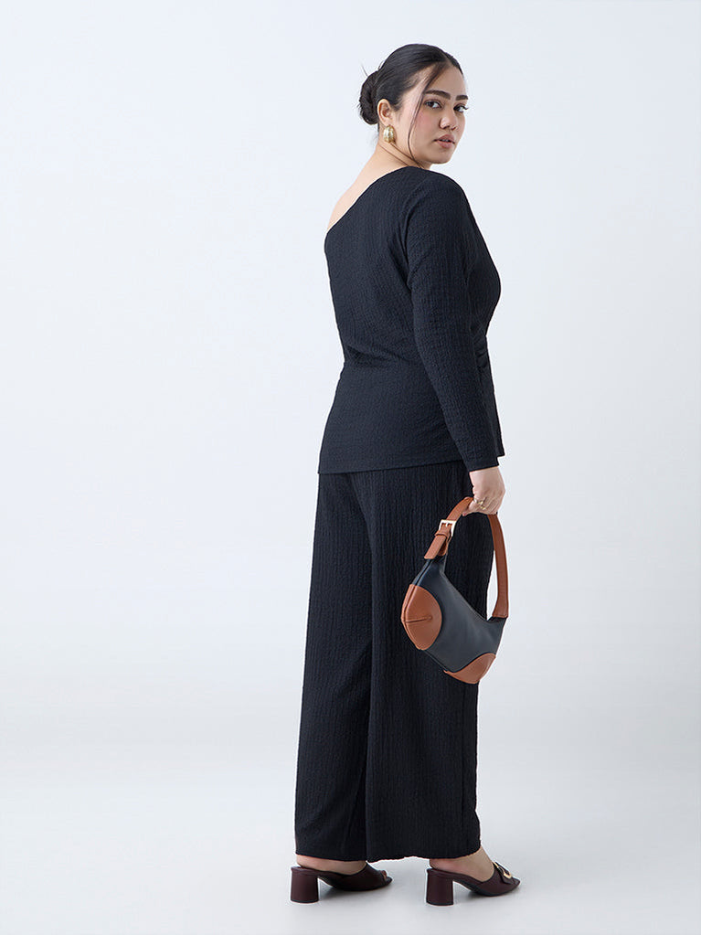 Sleek and statement-worthy, this black one-shoulder top from Gia is made from a crinkle-textured fabric that adds depth and dimension. The asymmetrical neckline offers a bold silhouette, while ruched detailing along the full sleeve introduces just the right amount of drama.