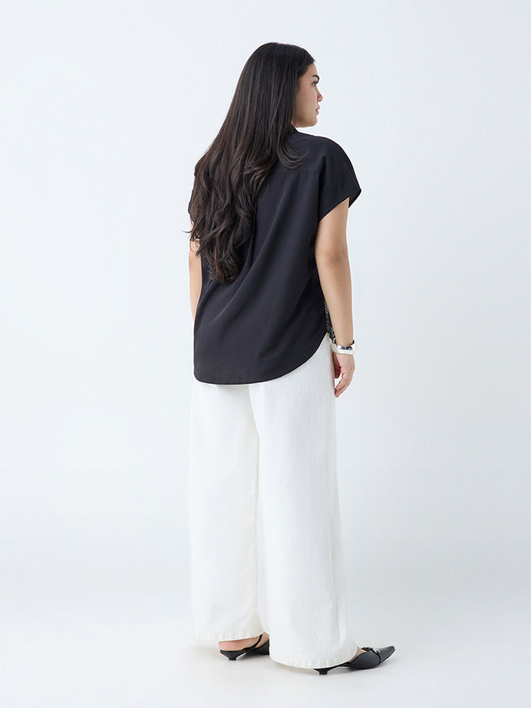 Crafted in a classic black hue, this stretchable top by Gia features delicate pearlescent detailing along the spread collar for an elegant touch. Designed in a soft fabric with full sleeves, it offers a refined silhouette that transitions seamlessly from workwear to evening outings.