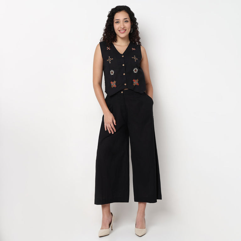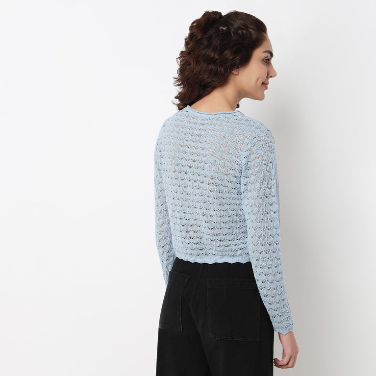 Gia brings this black top crafted from a quality fabric for lasting comfort. It features a ribbed round neck and full sleeves, enhanced with subtle embellished detailing that lends a touch of elegance, a versatile pick for both casual and polished looks.