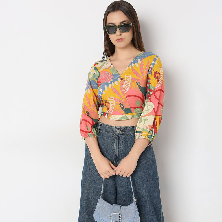 This printed pattern crop top has a v neck and three-fourth sleeve. Made from rayon, it is soft and comfortable to wear.