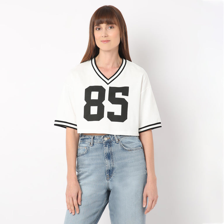 Boxy Fit V-Neck Athleisure Graphic Crop Tee