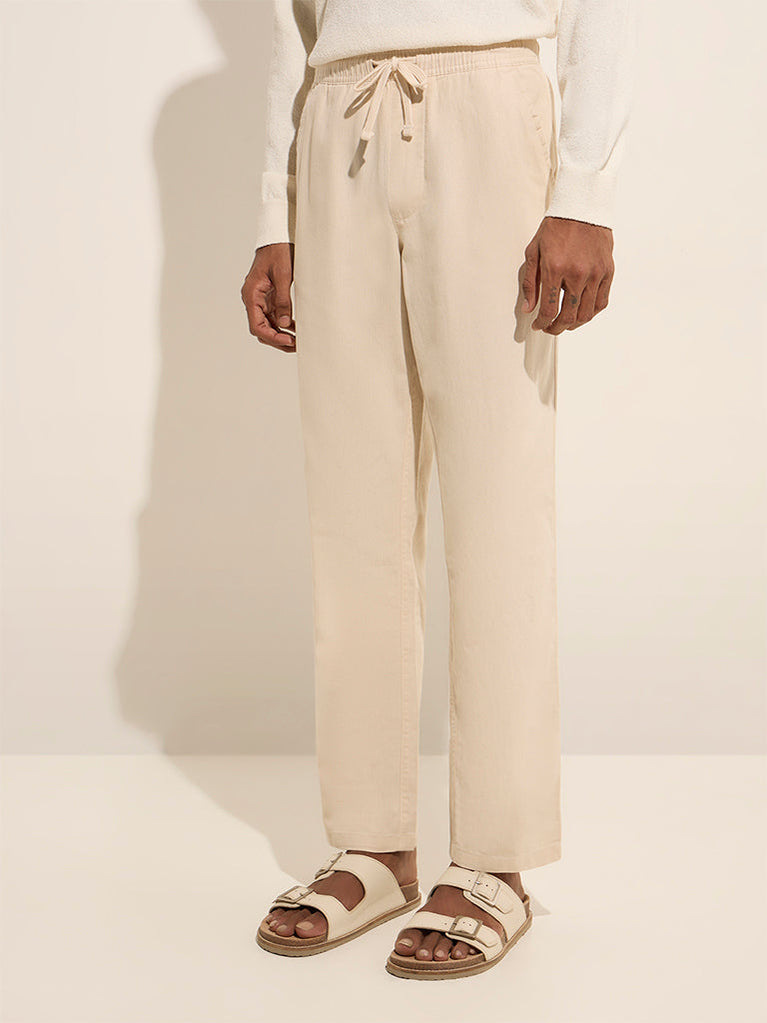 These beige chinos by ETA are carved in a relaxed-fit frame. Made from quality fabric, the mid-rise bottom wear carries a smooth elastic waistband, adjustable drawstrings and multiple pockets.