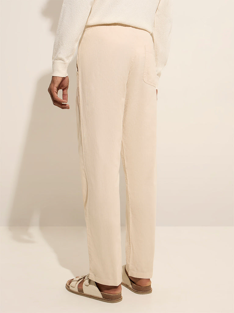 ETA Beige Pinstriped Relaxed-Fit Mid-Rise Cotton Trousers