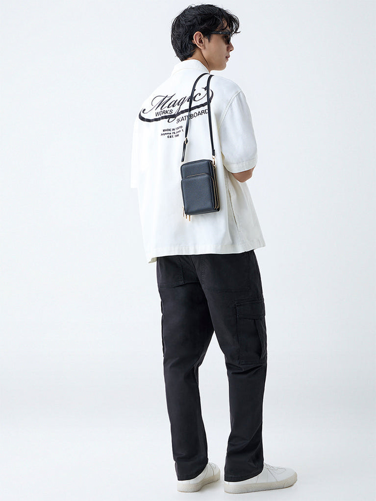 These black cargo pants from ETA redefine utility with a relaxed profile designed for everyday ease. Crafted from a soft cotton-blend fabric, they deliver comfort without compromising on style. A smooth buttoned waistband with adjustable drawstrings ensures a customised fit, while a secure zipper fly and multiple pockets lend a functional bonus.