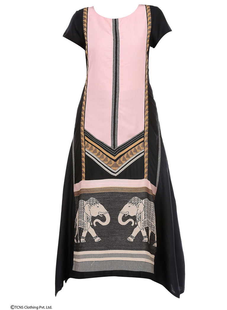 This black and pink round neck short sleeve kurta has printed detail on the front with flared hemline.