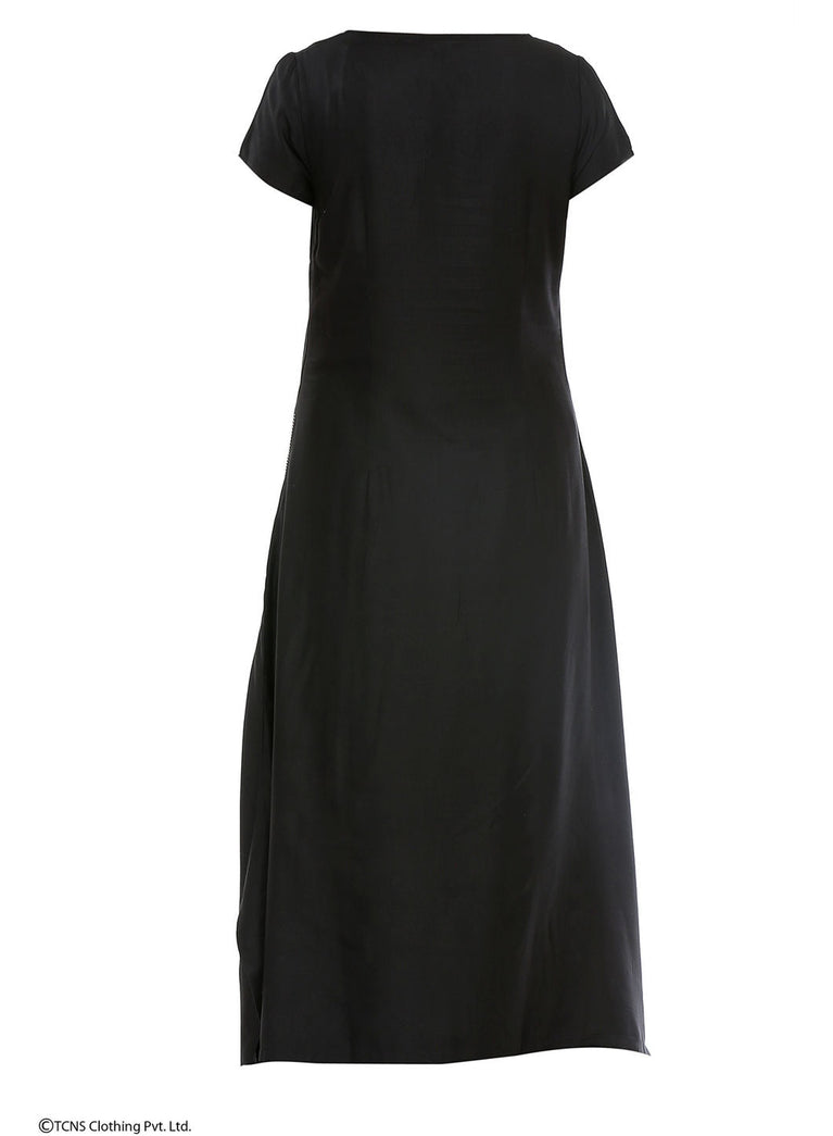 Flaunt sartorial elegance when you wear this black printed short sleeve round neck polyester kurta with 48"length from W's #UNETHNICALS collection.