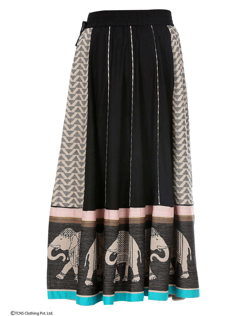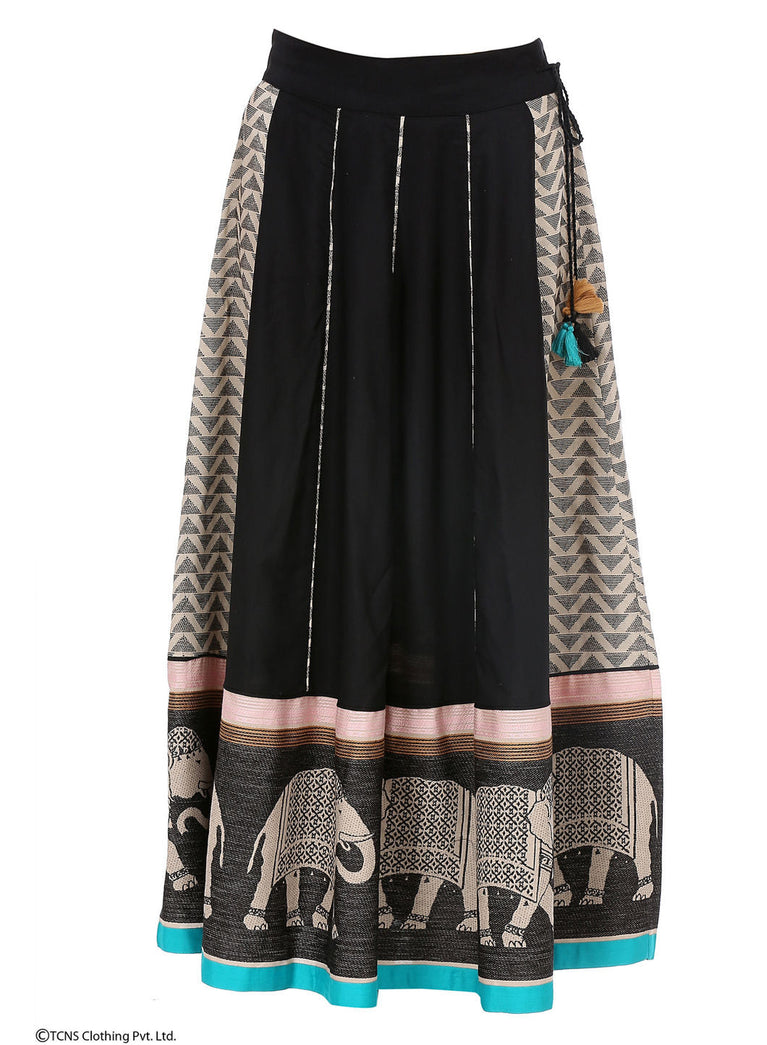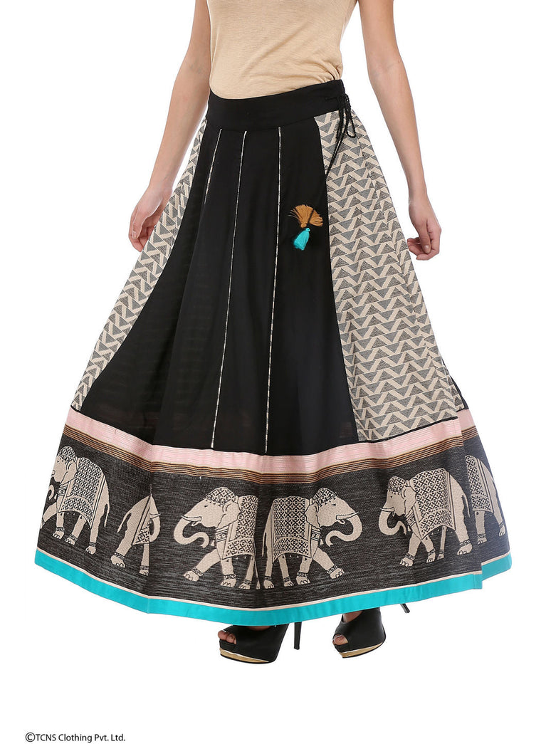 This black skirt has printed detail, elasticated back with side zip and tie-up detail, small danglars with flared hemline.
