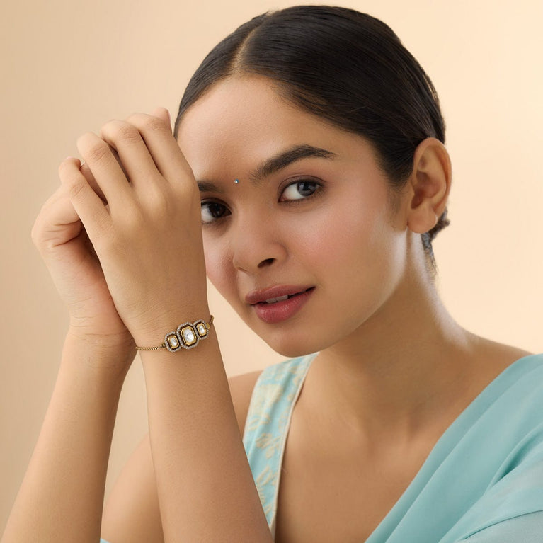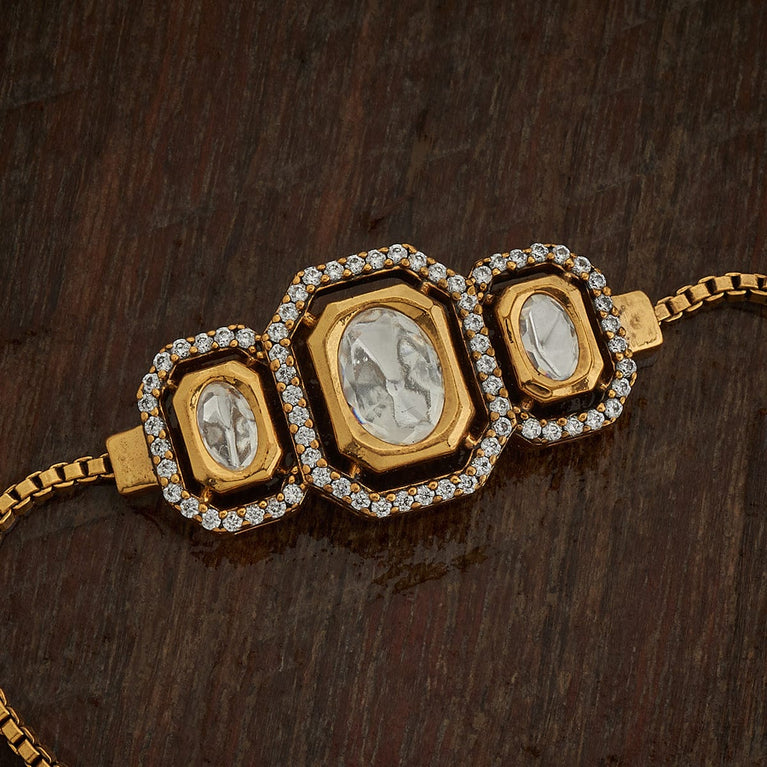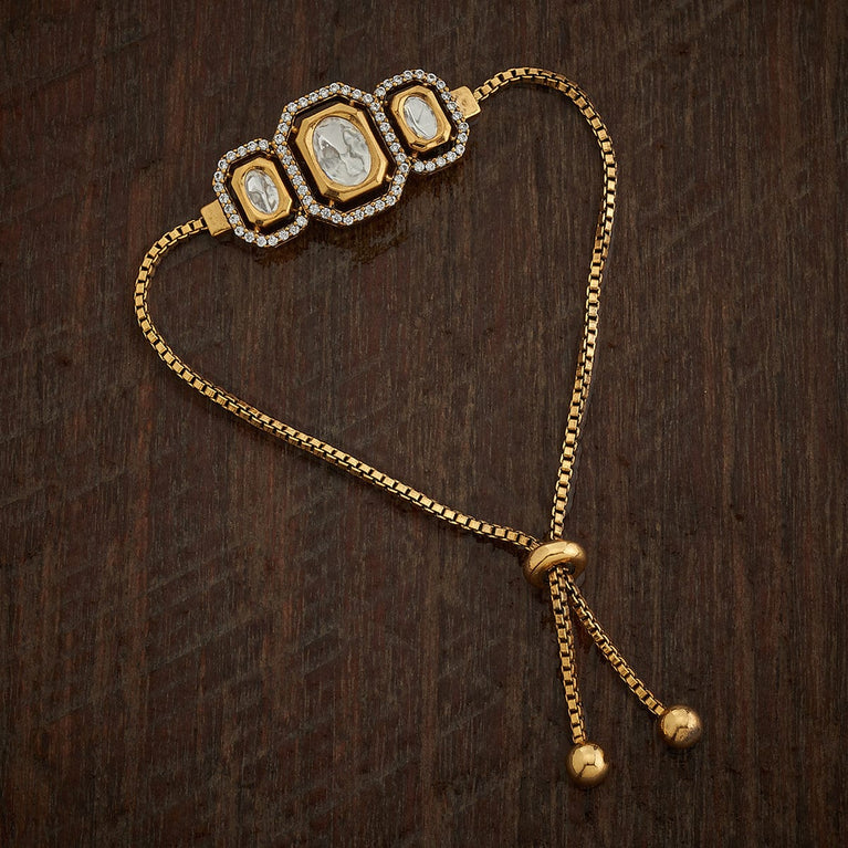Kushal's Fashion Jewellery Kundan BraceletOne of the reasons why fashion lovers love Kundan stones is due to their natural shine and elegance that help them stand out from the crowd. Allow our latest Kundan bracelet to give you this look for this wedding season. The intricate work details and the studded Kundan stones are more than enough to make you the center of attraction.