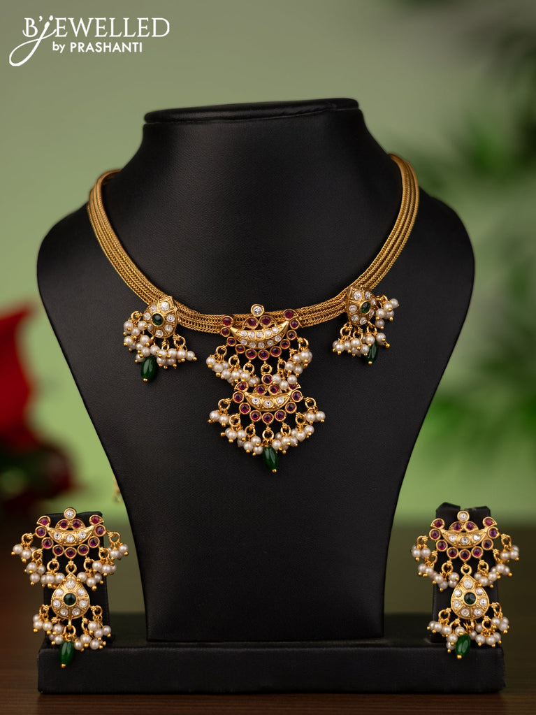 Antique attigai necklace with kemp & kumdan stones and pearl hangings