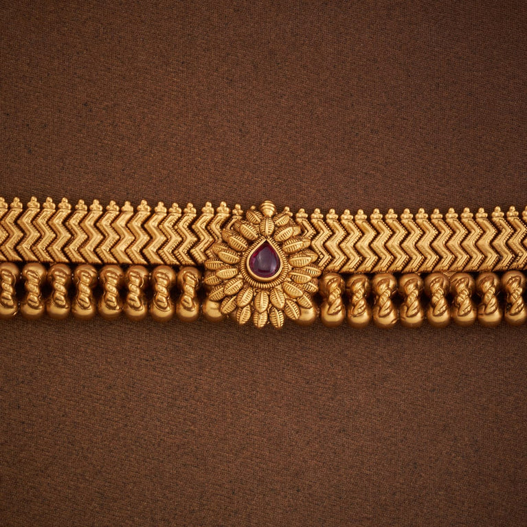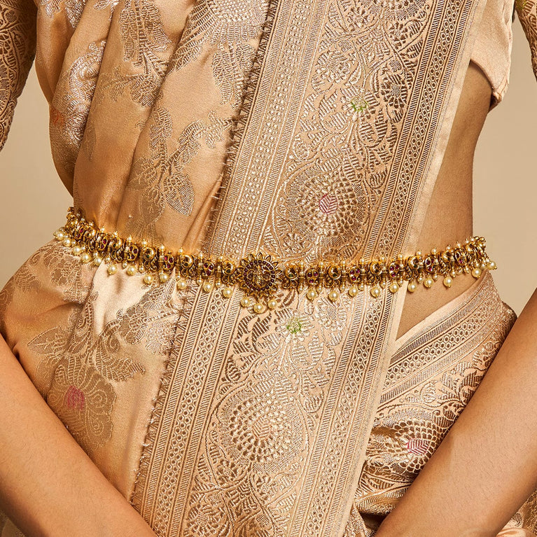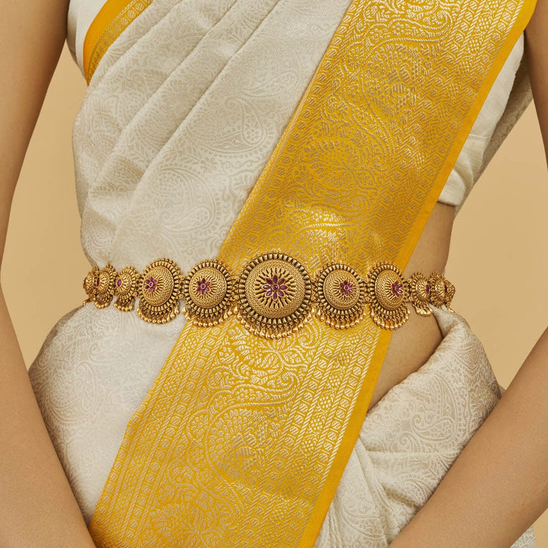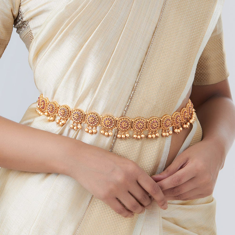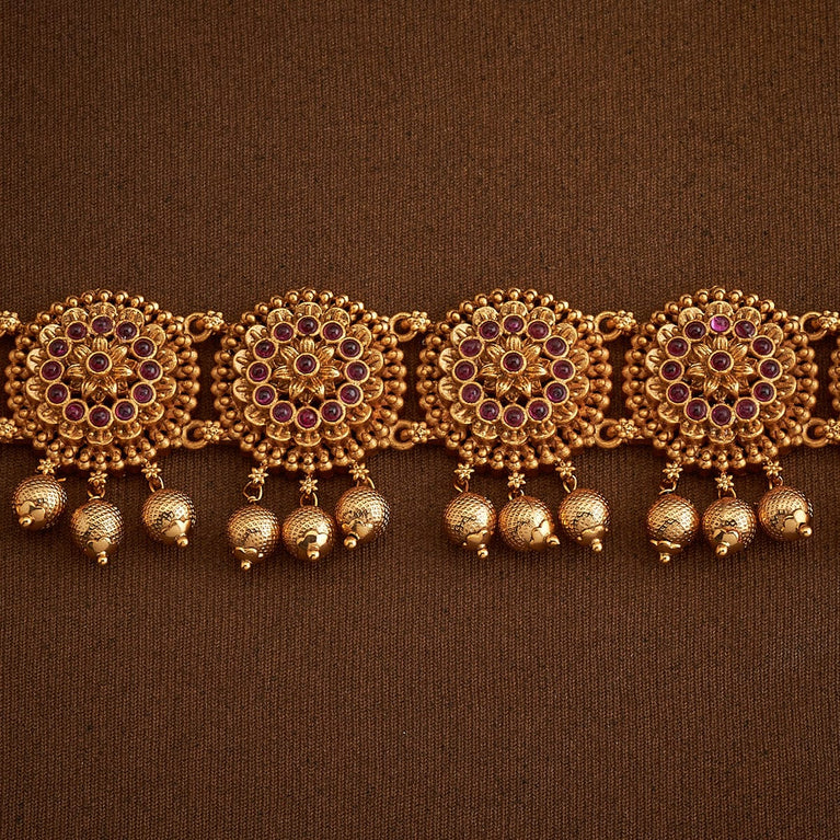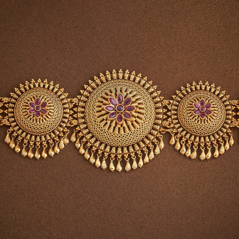 Kushal's Fashion Jewellery Flower Motif Antique BeltLooking for that perfect accessory to enhance your outfit? Look no further! Our antique belt is the perfect piece for you! The belt boasts a copper alloy base metal, expertly embellished with a radiant ruby-coloured synthetic stone. Whether traditional attire or a modern ensemble, this beautifully designed belt is versatile and never fails to make a statement.