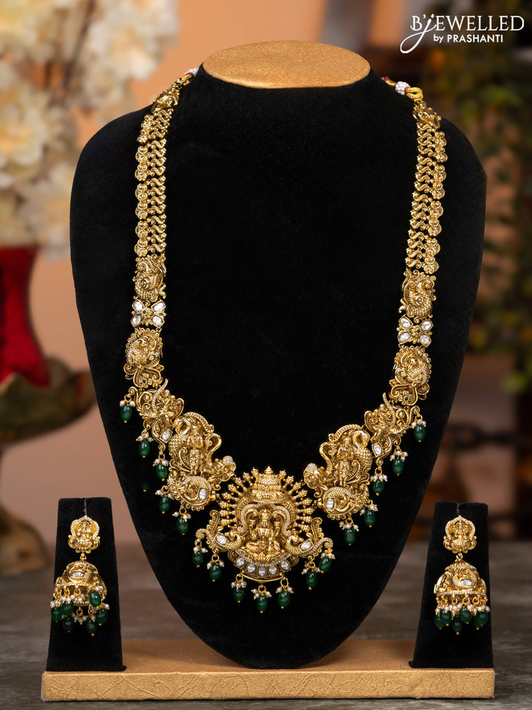 Antique haaram lakshmi design with kundan & cz stones and green beads hangings