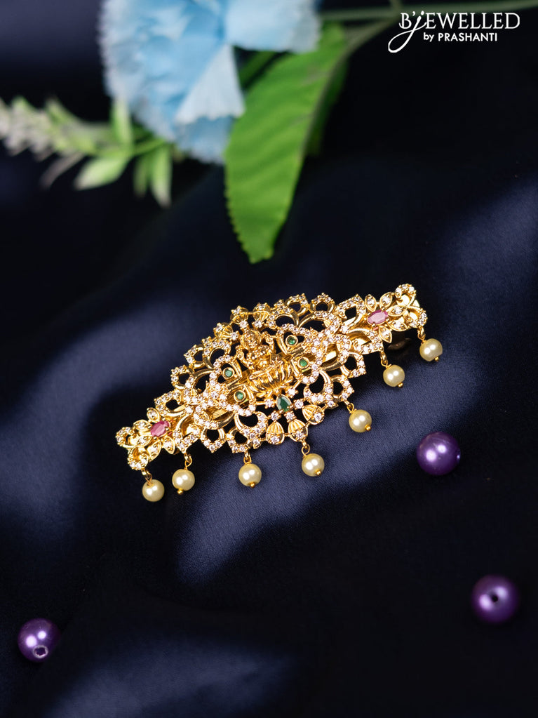 Antique hair clip medium size lakshmi design with kemp stones and pearl hangings