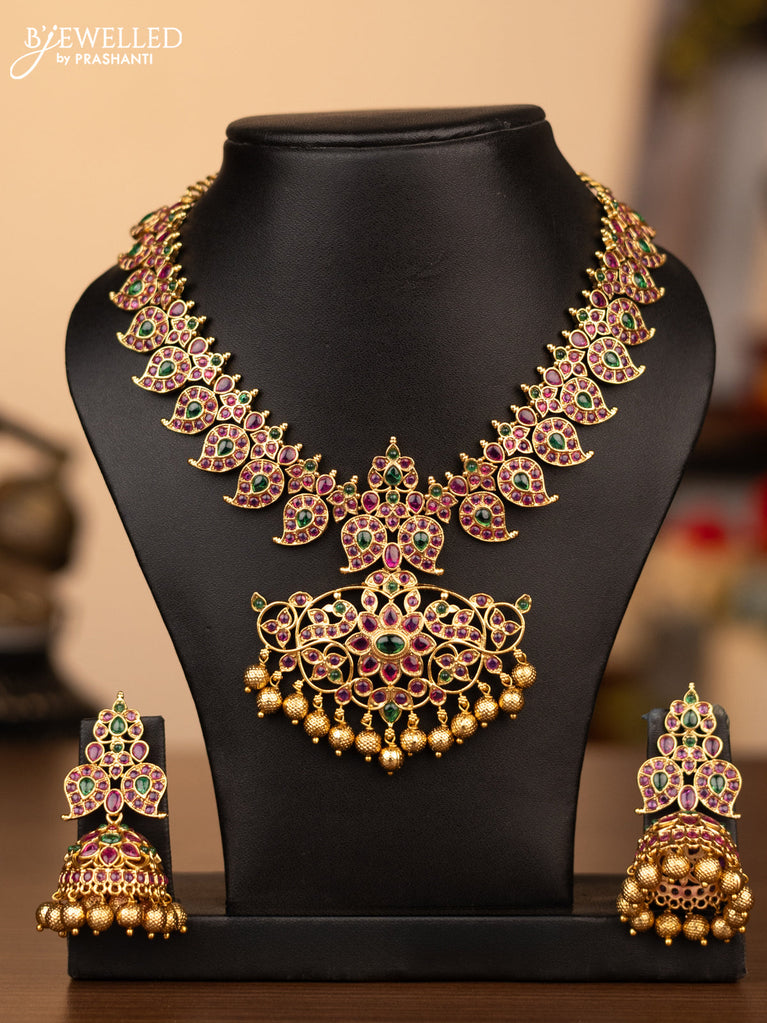 Antique necklace peacock design with kemp & cz stones and pearl & green beads hanging without earrings