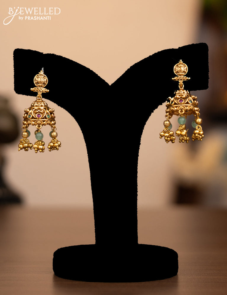Antique necklace manga pattern with green kemp stones and golden beads hanging
