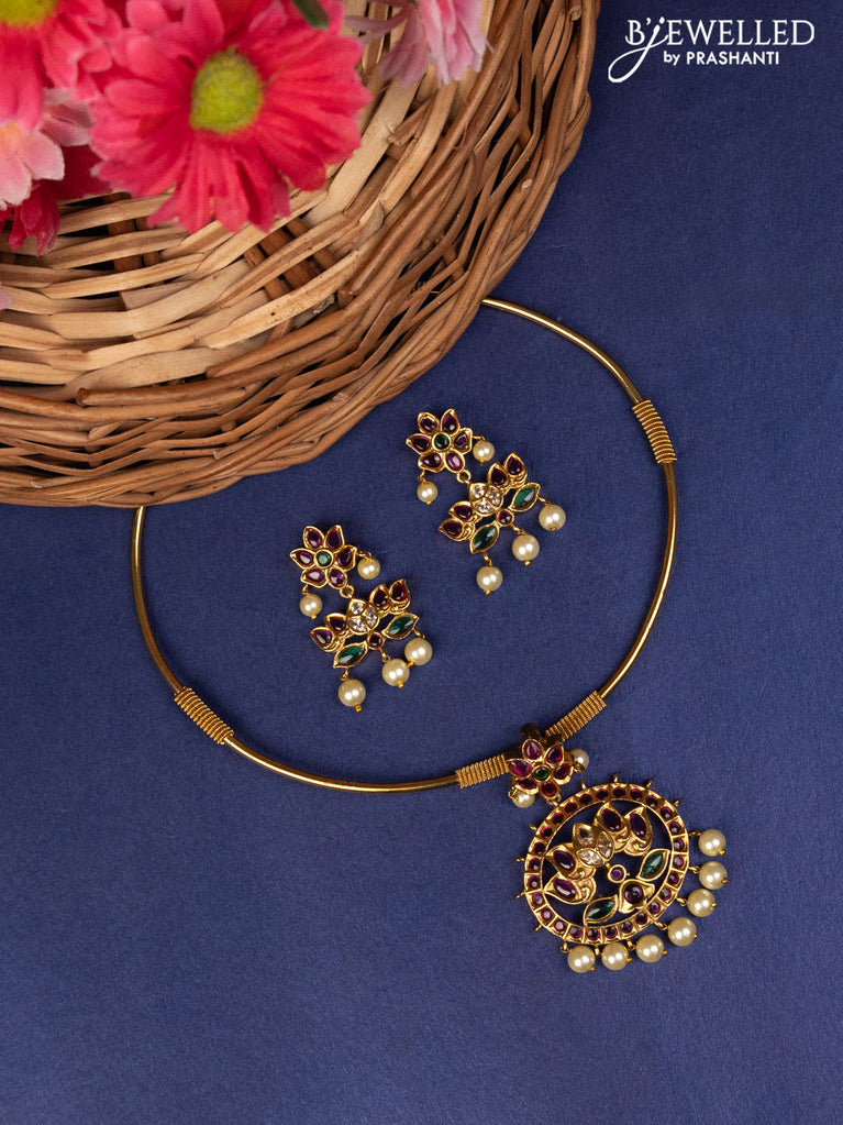 Antique ring type choker floral pendant with kemp & cz stone and pearl hangings without earrings