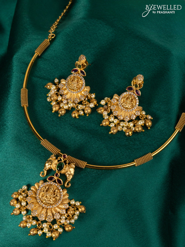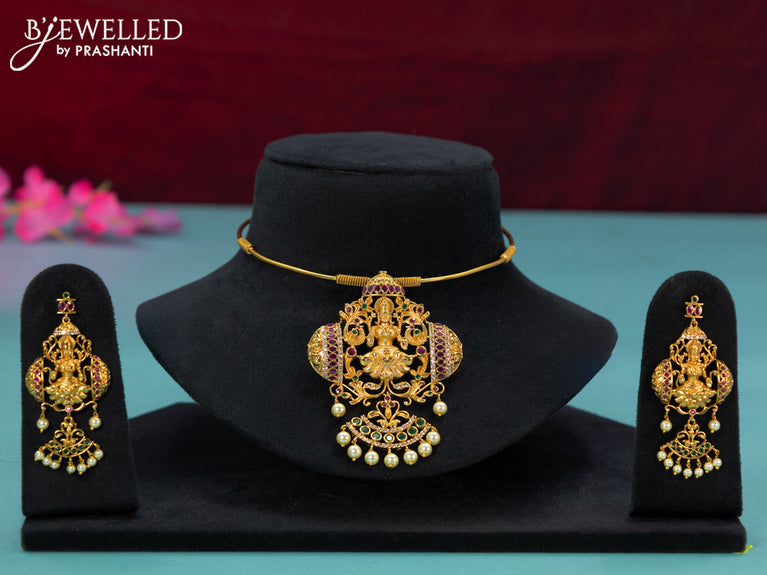 Antique ring type choker kemp & cz stones with lakshmi pendant and pearl hangings