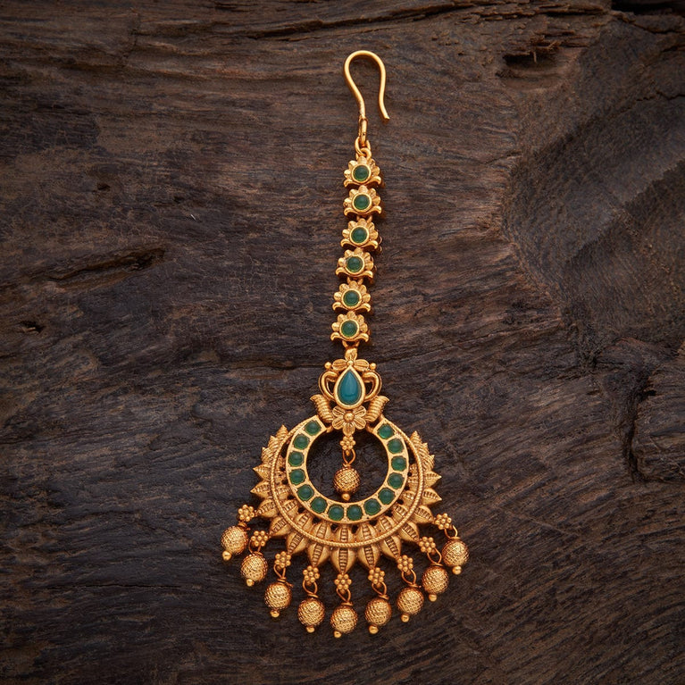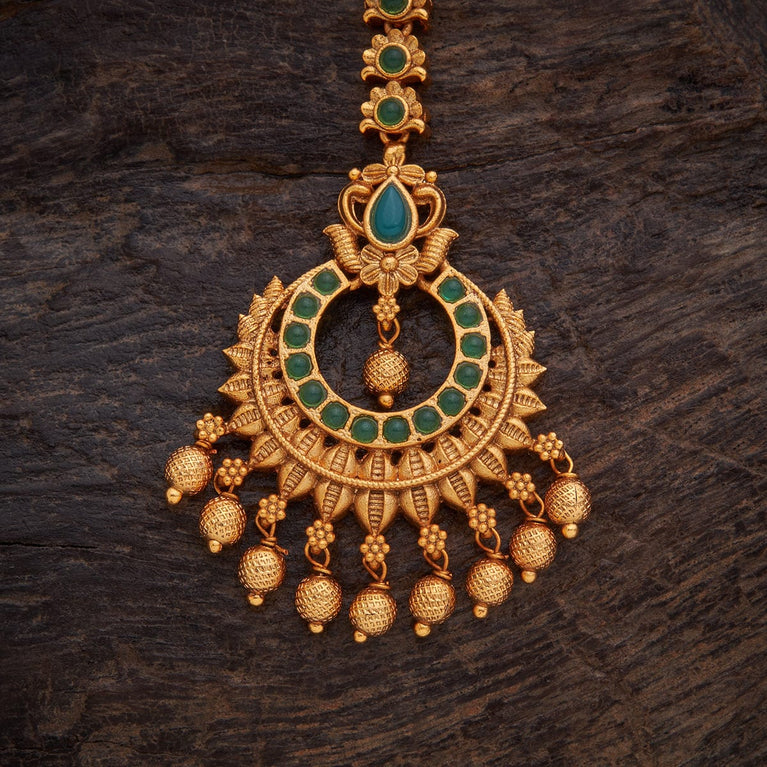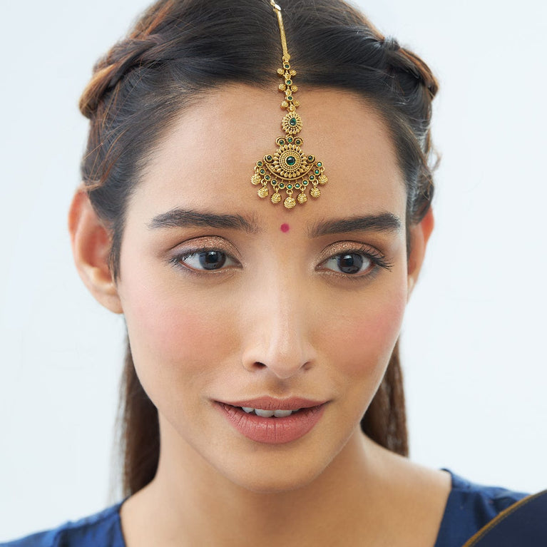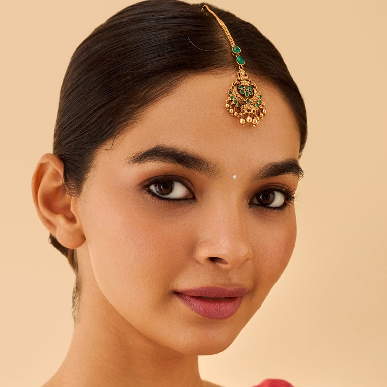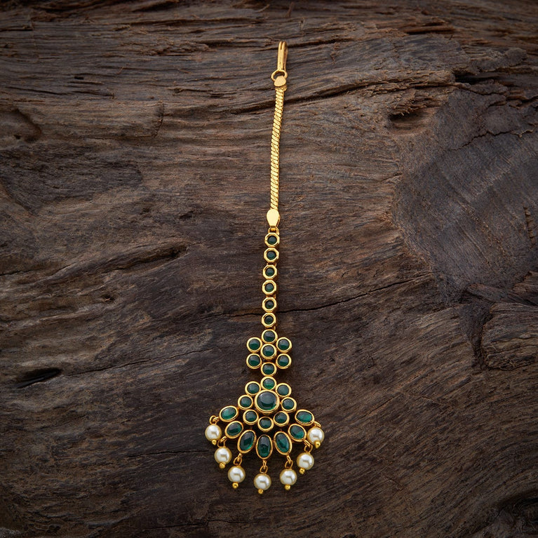 Green Bridesmaid Mang Tikka Embalished with stones One of the most antique jewelries of all time, a magnificent piece of Silver Temple Maang Tikka jewellery. Its flawless green color makes it super-gorgeous and dazzling. It is accompanied by an awe-inspiring design and the stones on it are undoubtedly the finest center of attraction. Time for you to steal the show by adding this mang tikka to your vibrant outfit.